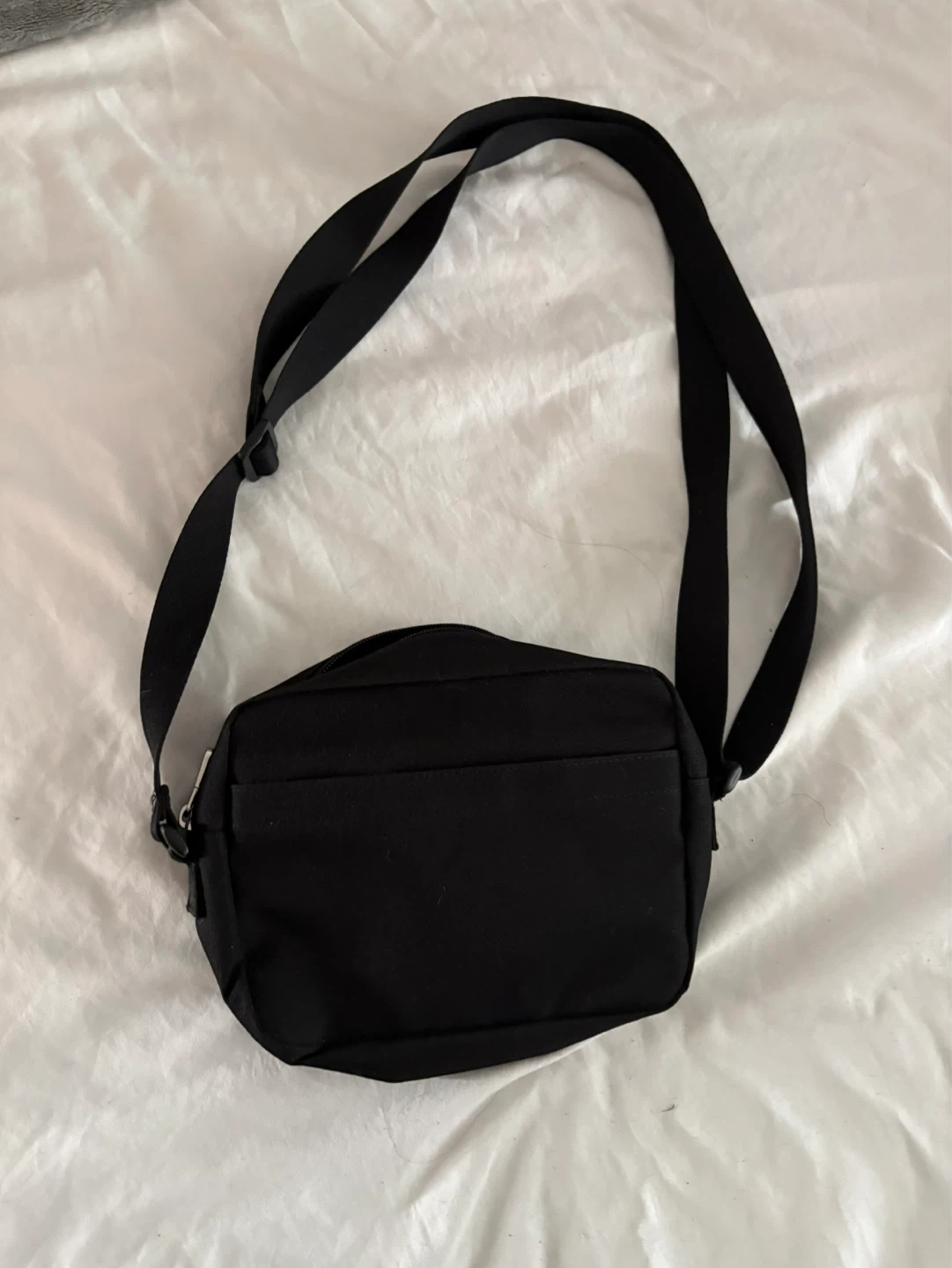 This is a black Calvin Klein crossbody bag with the brand name printed in white. It has an adjustable strap and zippered closure. The interior features a small pocket.