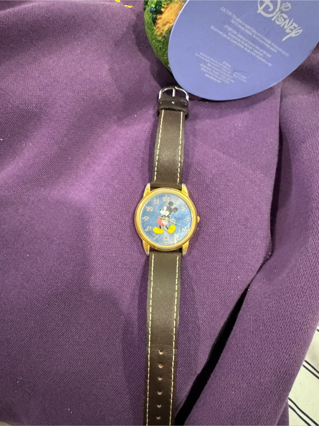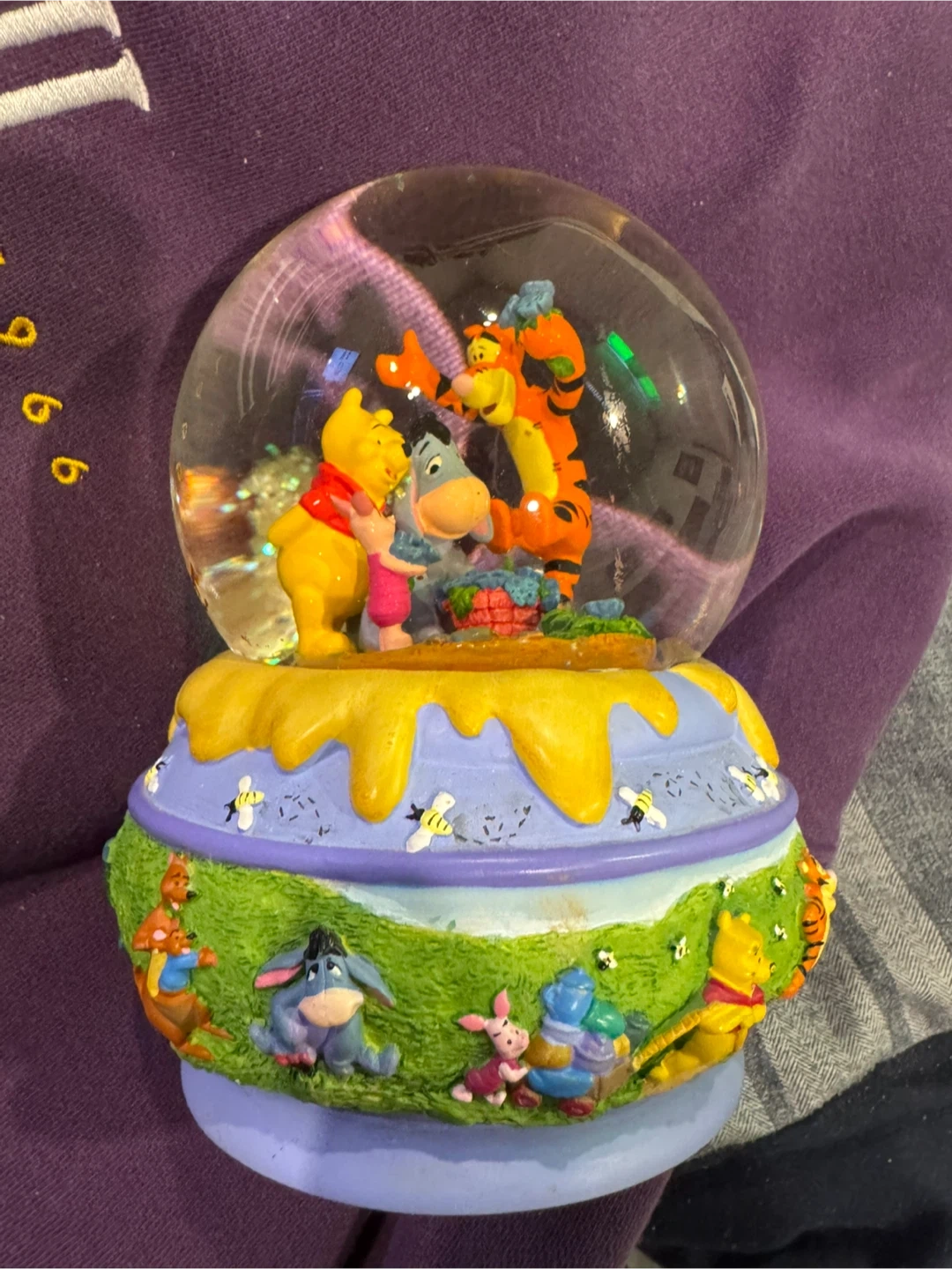 Vintage Disney purple sweatshirt featuring Winnie the Pooh. Crewneck style with ribbed cuffs and hem. Made of a comfortable cotton blend. Perfect for fans of classic Disney characters! Also a globe and watch