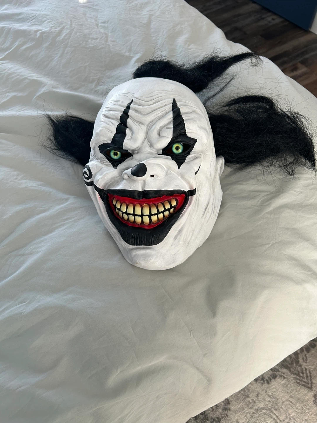 This mask features a classic scary clown design with green eyes and a wide, toothy grin. It's made of a white plastic material with attached black synthetic hair. Perfect for Halloween or costume parties!