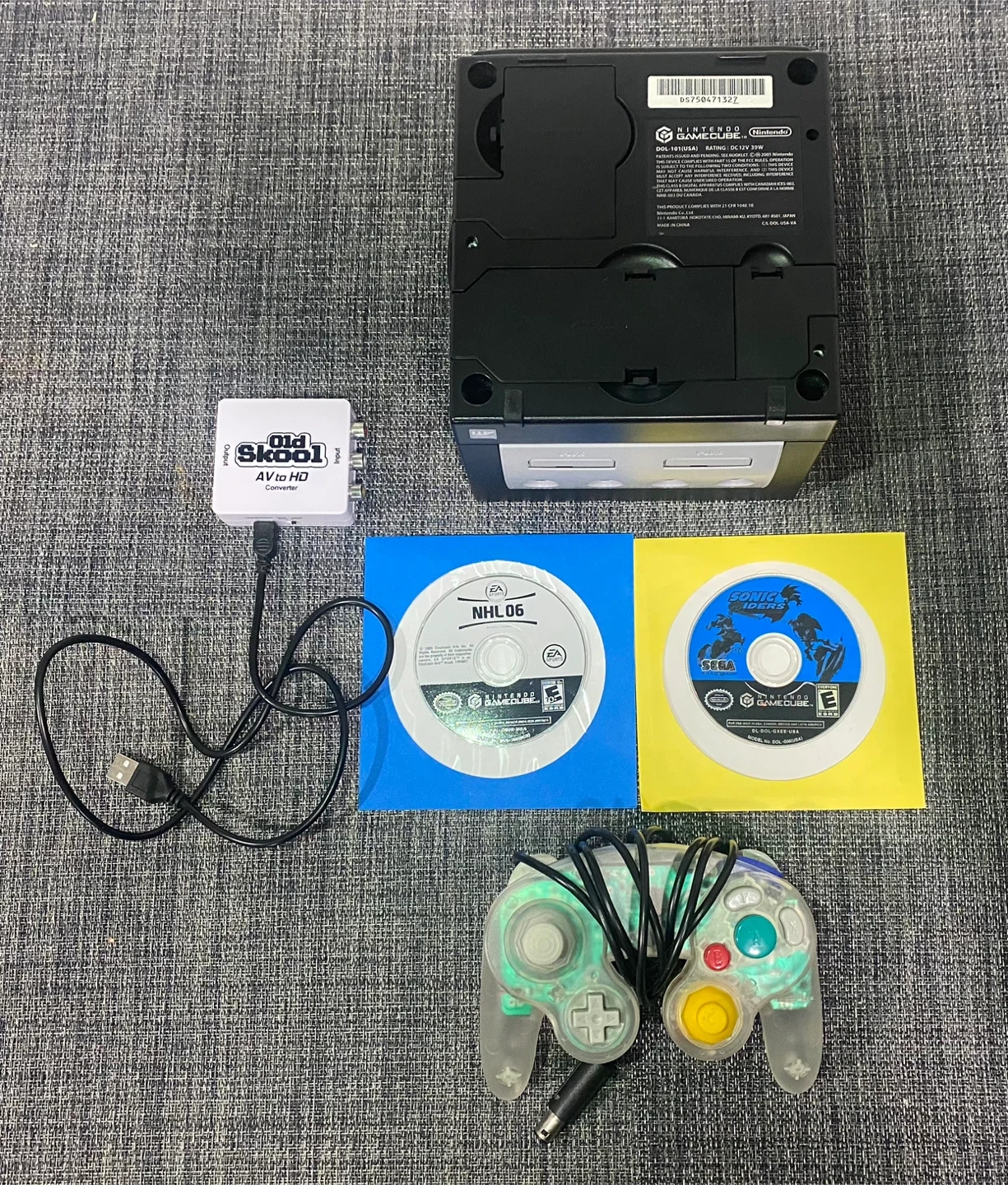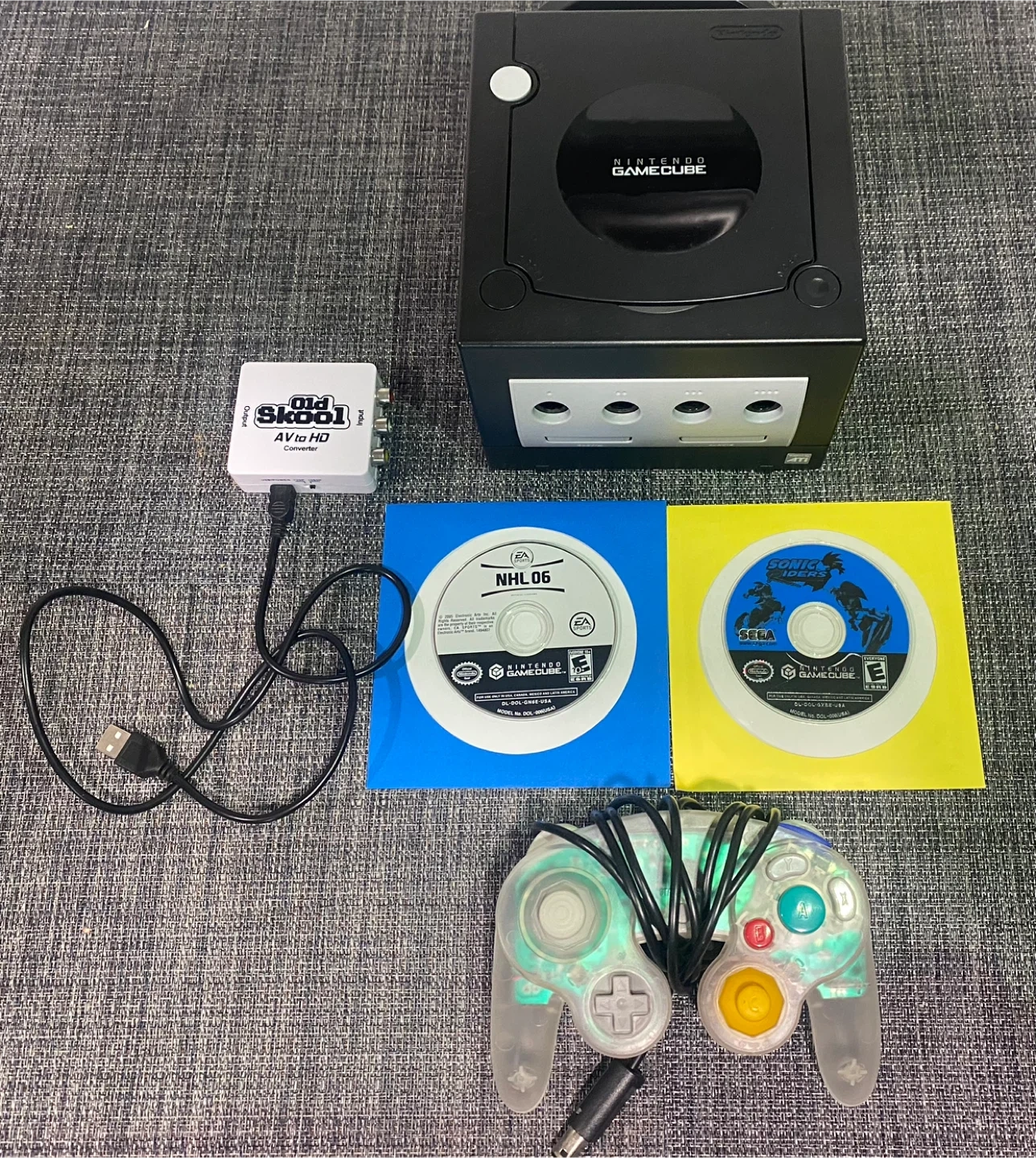 This bundle includes a black Nintendo GameCube console in mint condition and a clear transparent controller. Two games, NHL 06 and Sonic Riders, are also included. An AV to HD converter is also part of this package. Everything has been tested and is working flawlessly. Check out my other listings for more video games and collectibles.