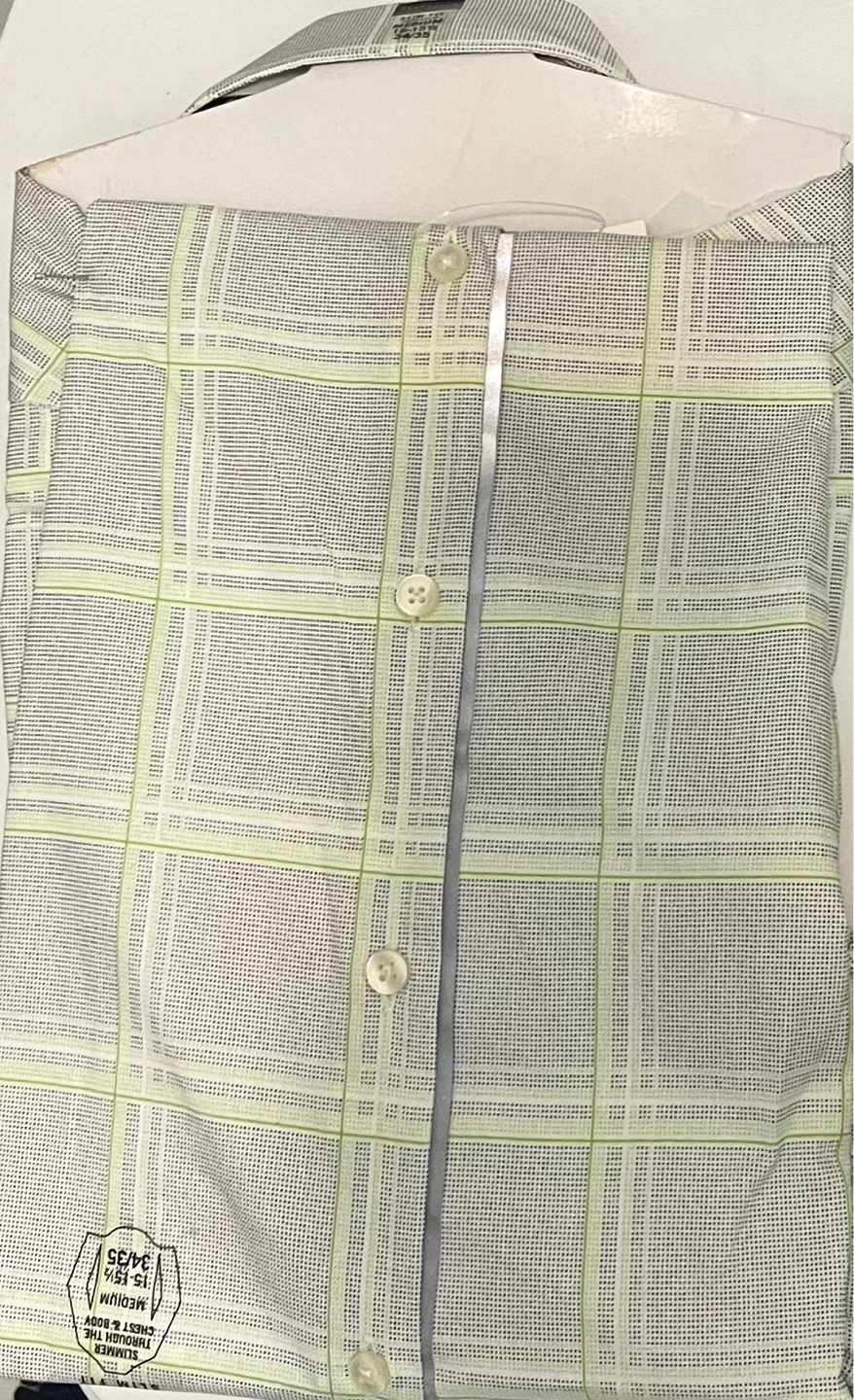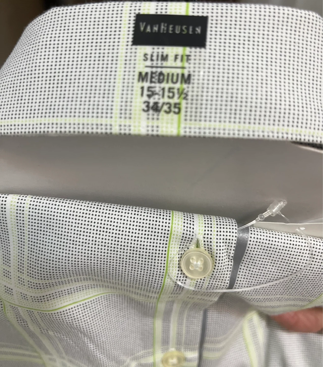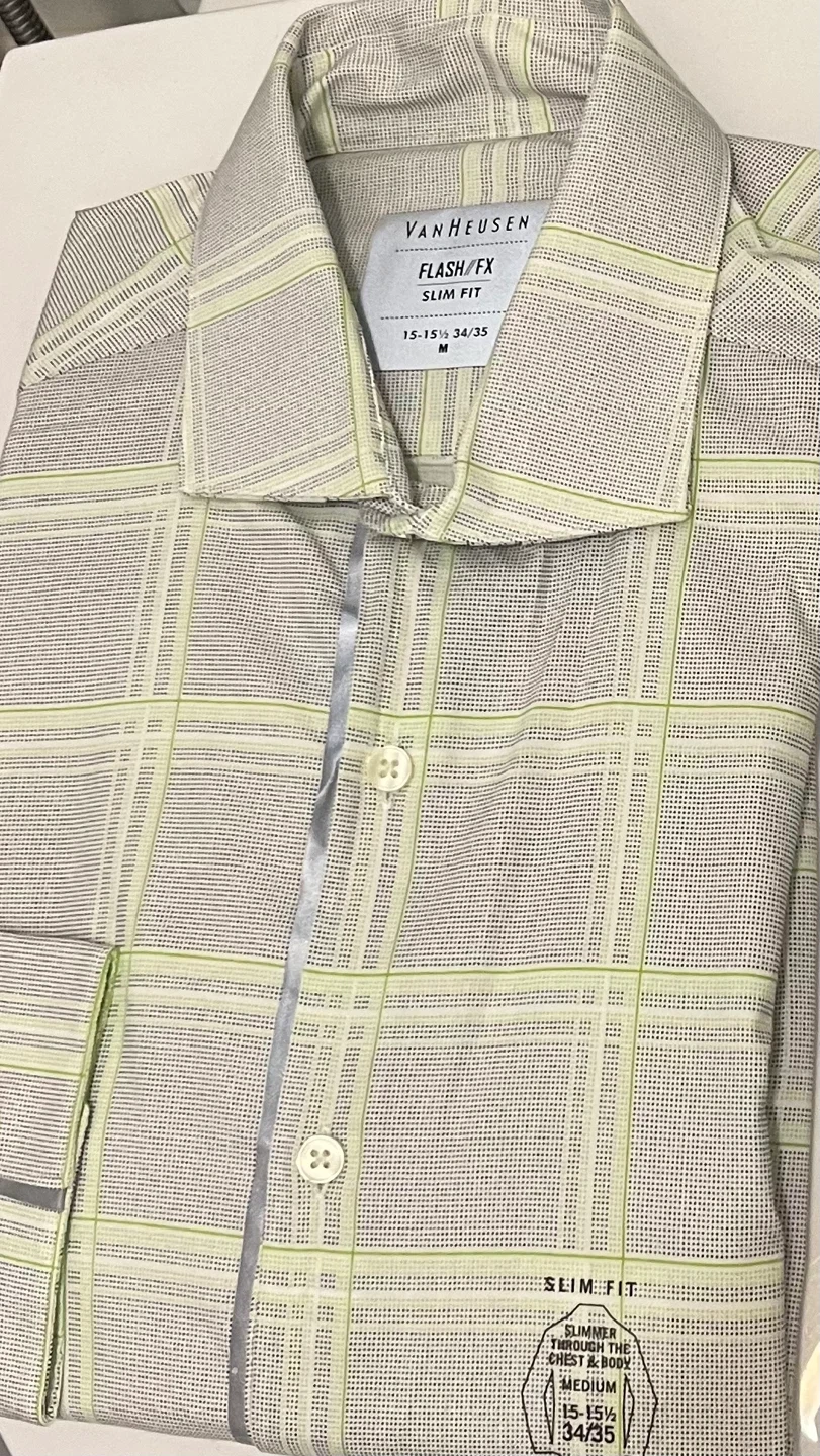 This is a Van Heusen men's dress shirt in a slim fit. It's a size medium with a 15-15.5 inch neck and 34-35 inch sleeve length. The shirt features a subtle plaid pattern in white, grey, and lime green.
