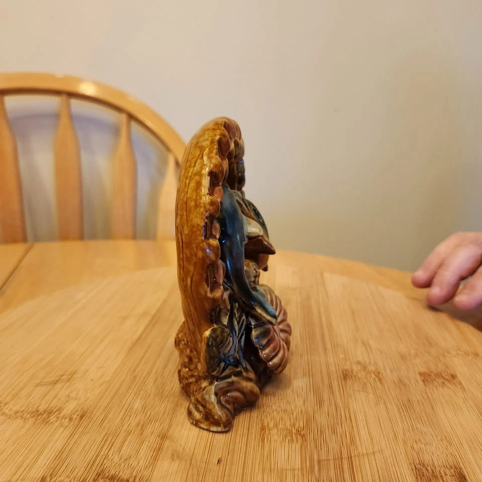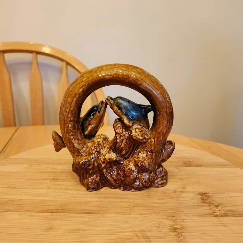This glazed dolphin figurine will make a wonderful addition to your home decor. Perfect for a bathroom, living area, or possibly in a terrarium or aquarium. Approximate measurements: 6" Length (leaf to dolphin tail), 5.5" Height, 2.5" Width (bottom of base). No chips, cracks, or breaks. $5. Cash only. Pick up in Varsity, NW.