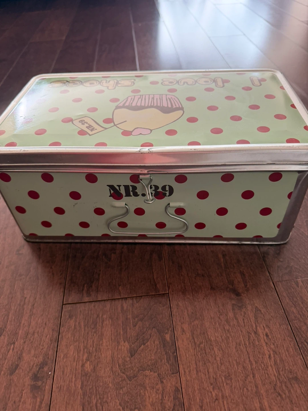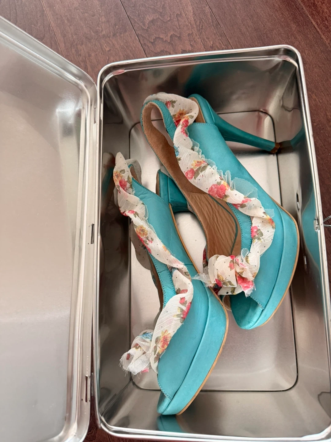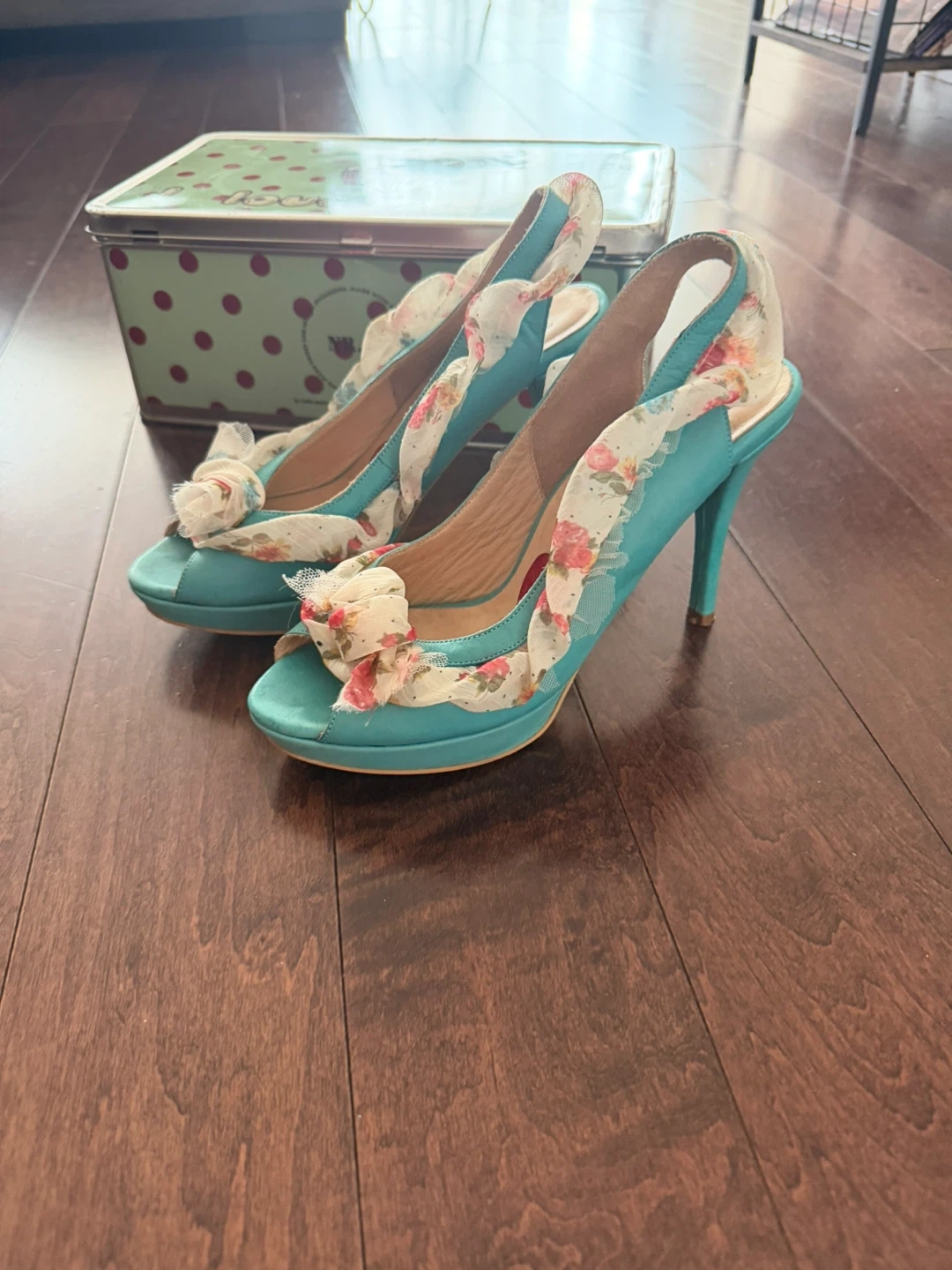 These stylish leather peep-toe heels come in a vibrant turquoise blue. They feature delicate floral ruffles around the open toe and heel strap. Includes a decorative "I love shoes" tin for storage.