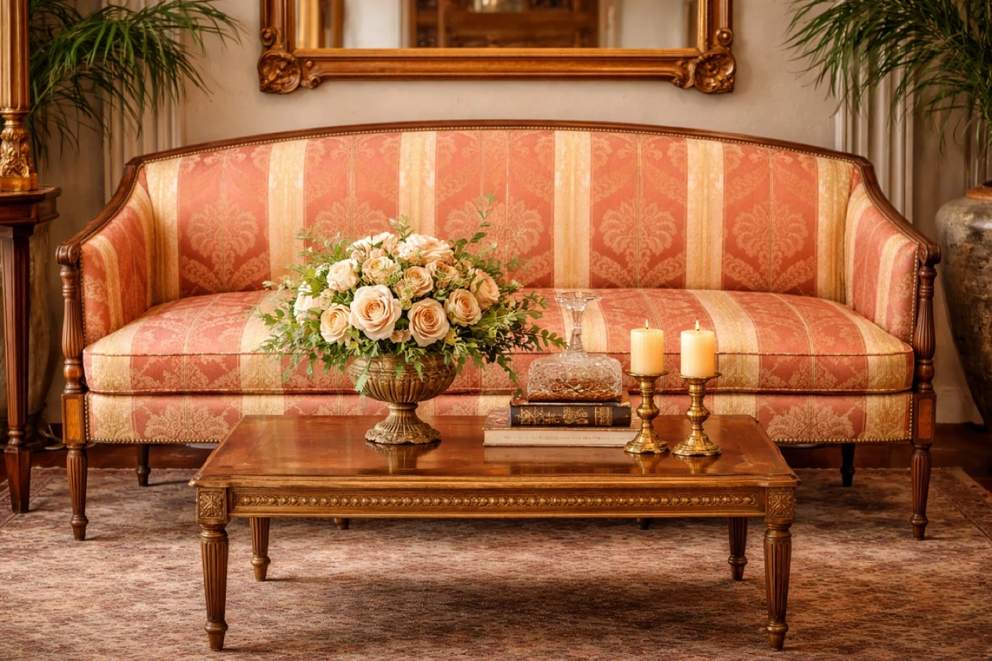 Vintage Sofa - Red & Cream Damask Upholstery