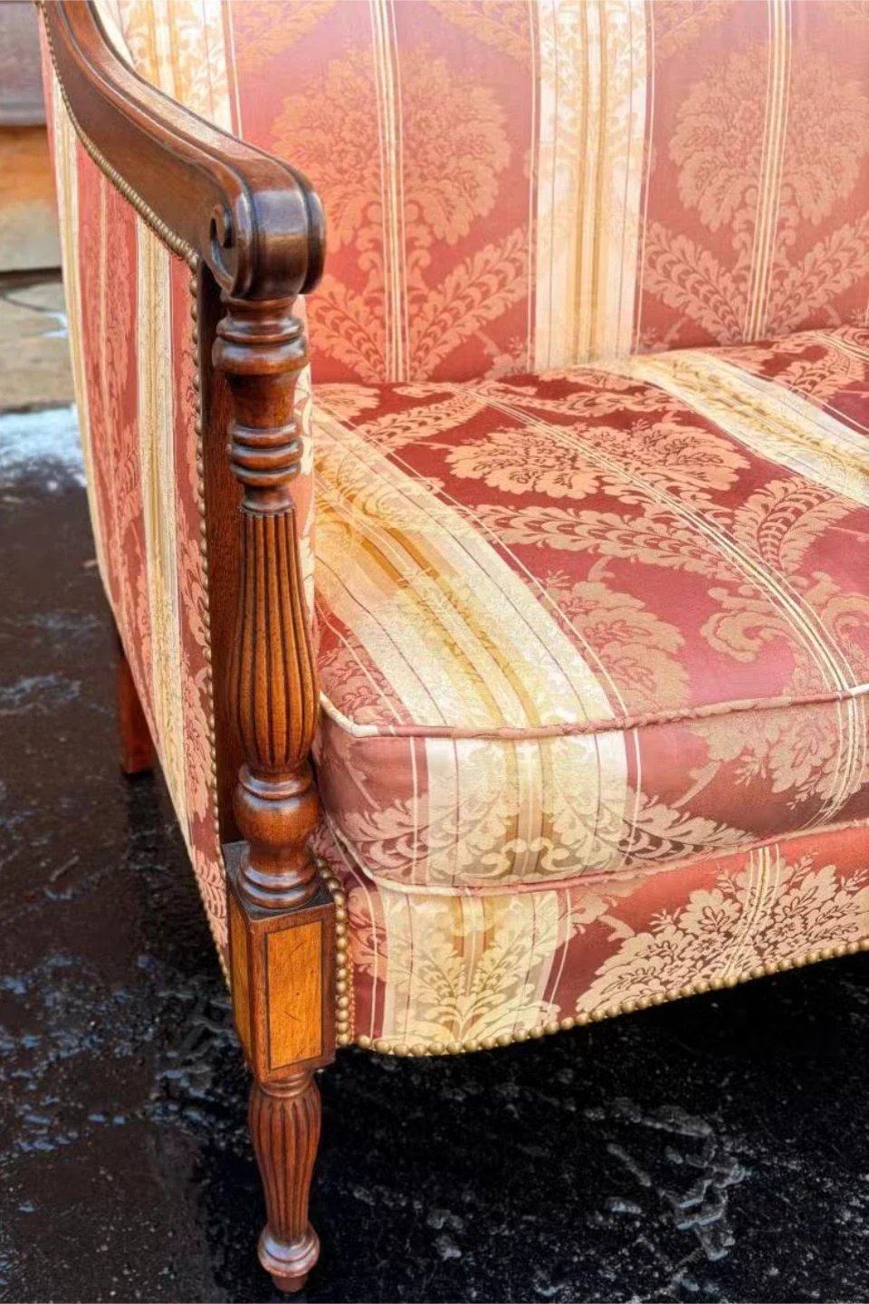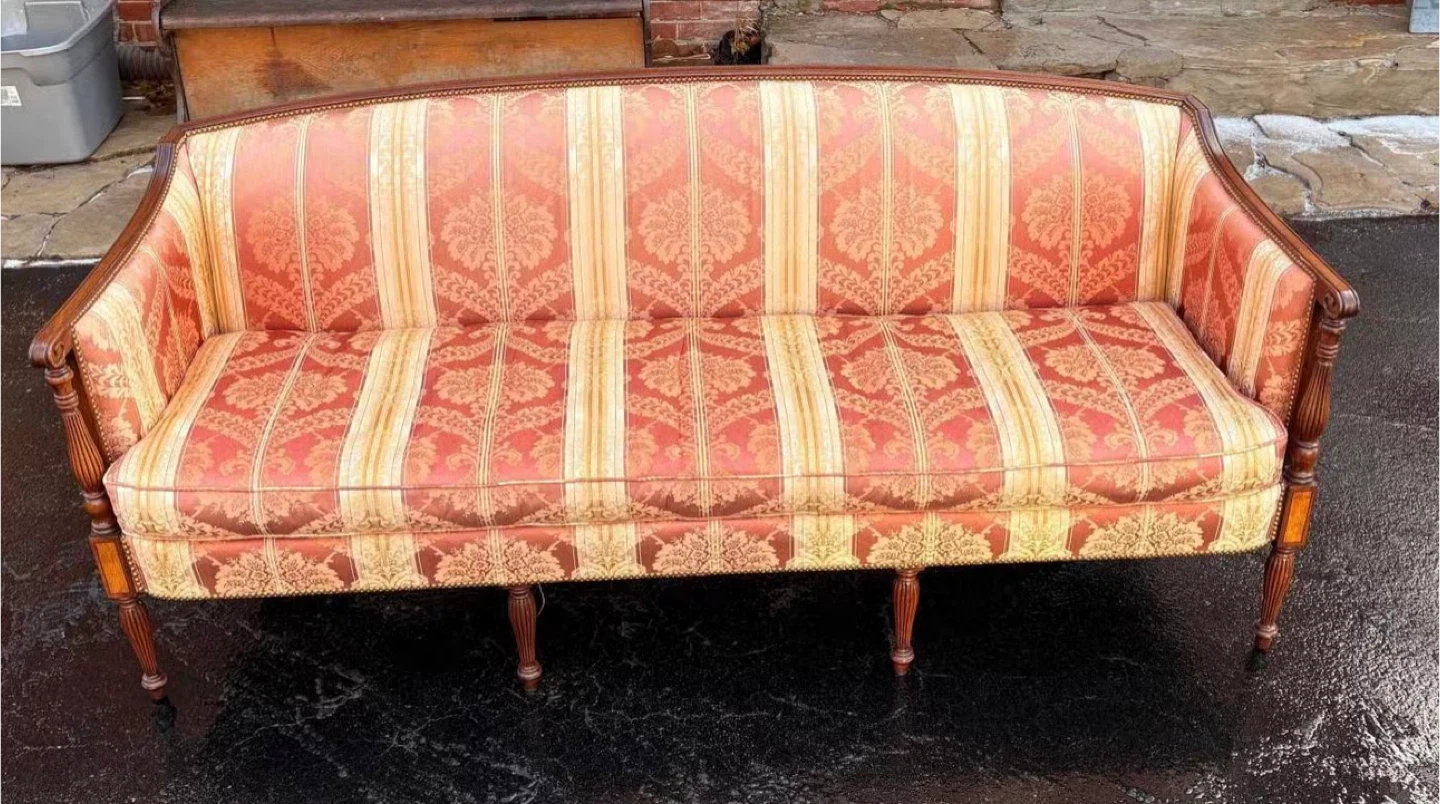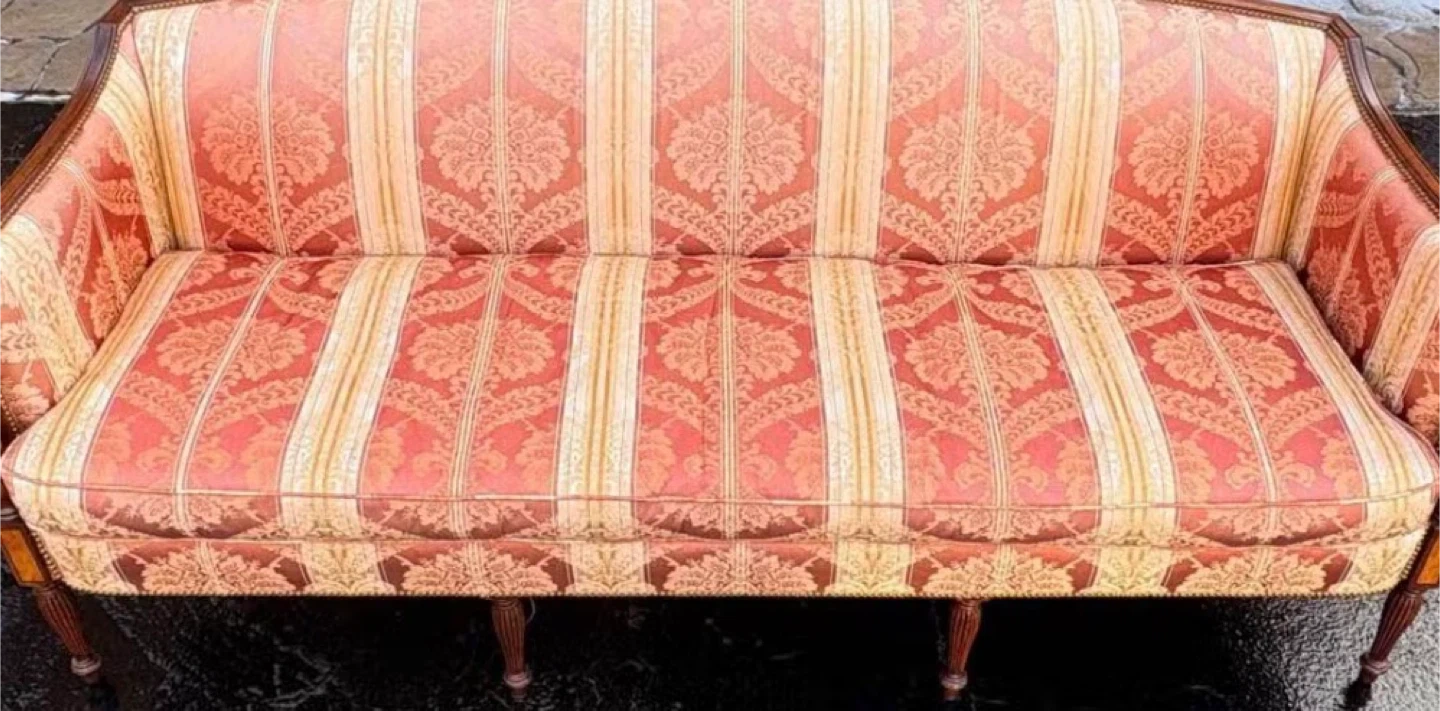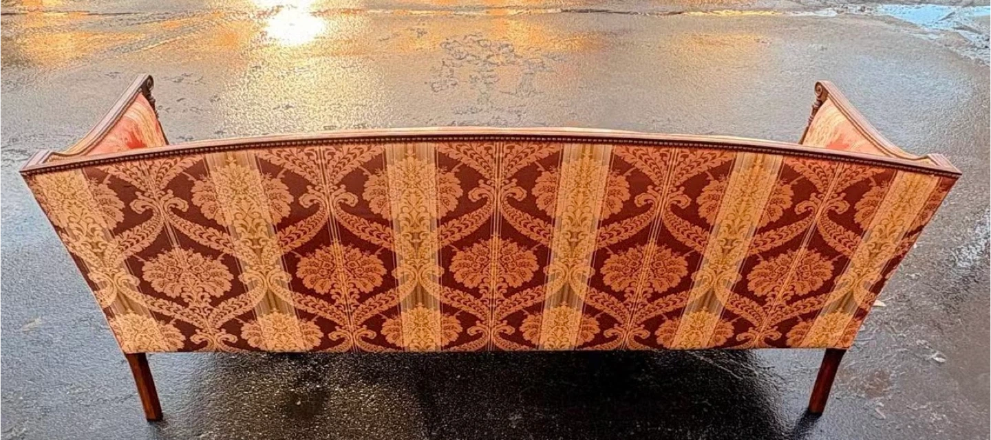 Elegant vintage sofa with a red and cream striped damask upholstery. It features carved wooden arms and legs, and decorative nailhead trim along the base. This piece is sure to add a touch of classic charm to any living space!