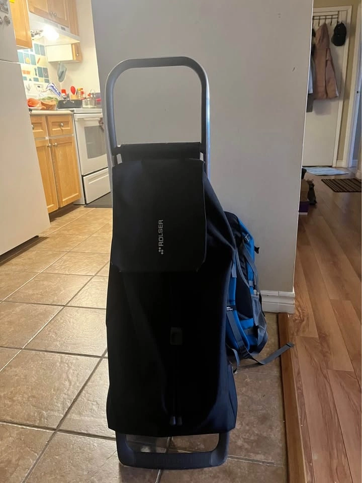 Rolser lightweight foldable shopping cart, perfect for groceries, laundry, or market trips. Features smooth rolling wheels, a sturdy aluminum frame, and a large fabric bag. Folds for easy storage. Very clean, barely used.