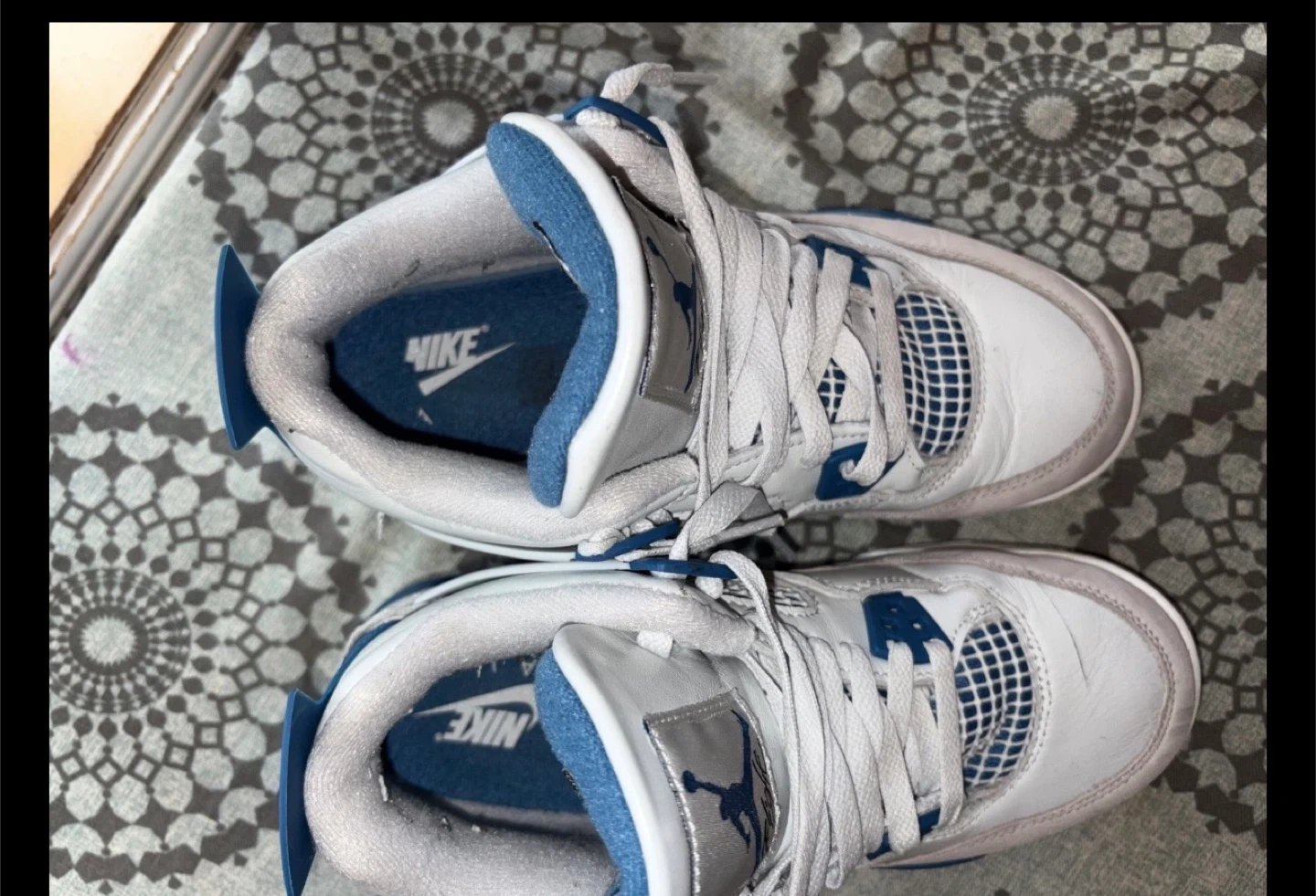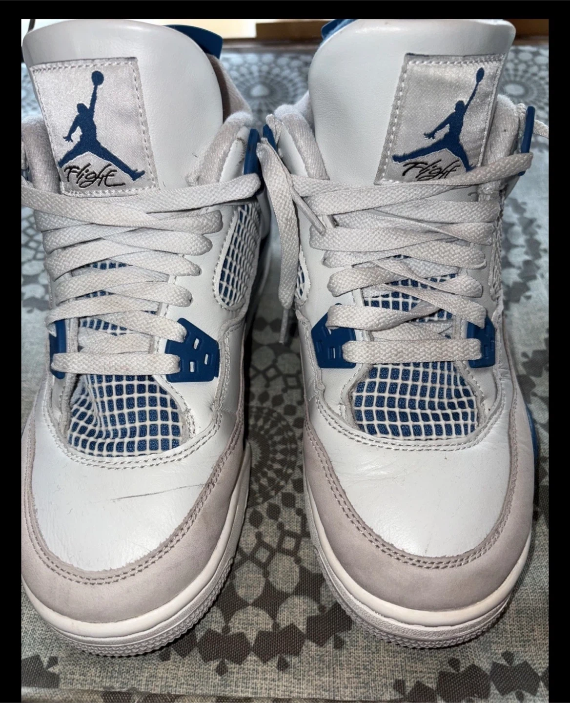 Classic Nike Air Jordan 4 sneakers in a white and blue colorway. Leather and mesh construction. These iconic shoes are a must-have for any sneaker collection!