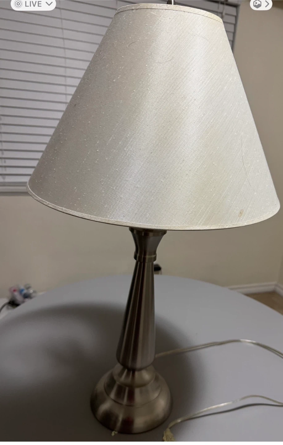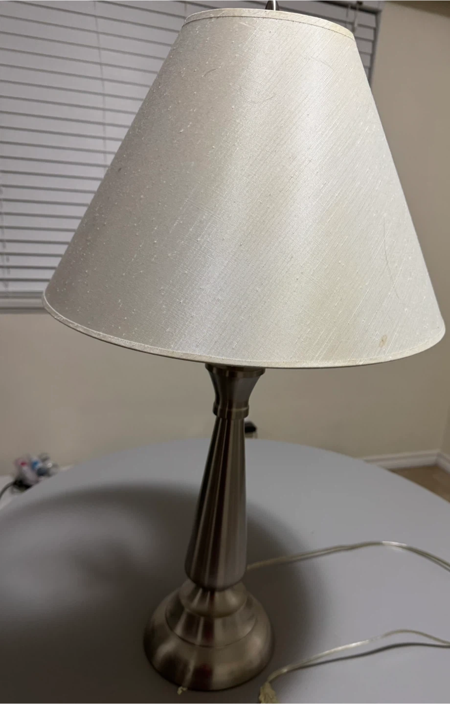 Elegant table lamp with a brushed metal base and classic off-white shade. Modern yet timeless design that complements any decor. Fully functional. Has some small spots on the shade.
