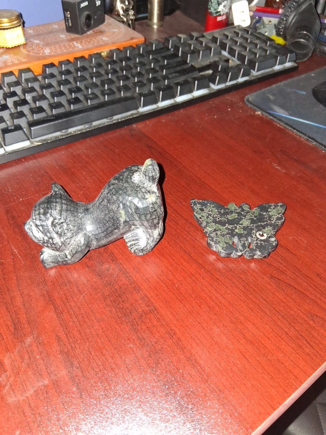 Selling two serpentine carvings. One is a cat and the other is a butterfly. They would make a nice addition to any collection!