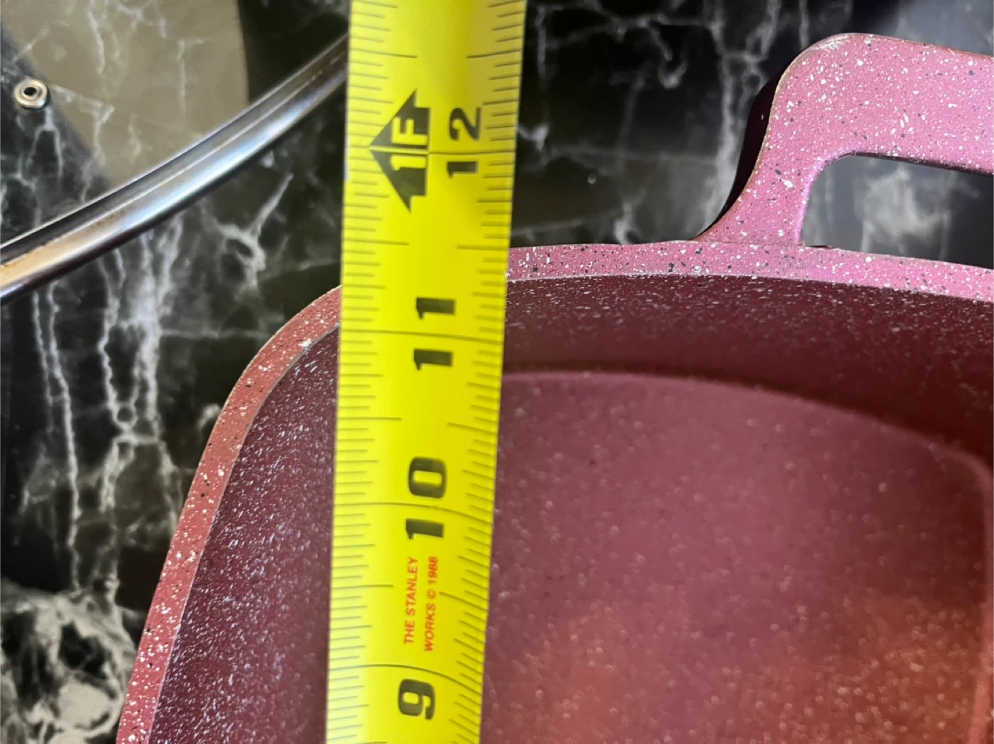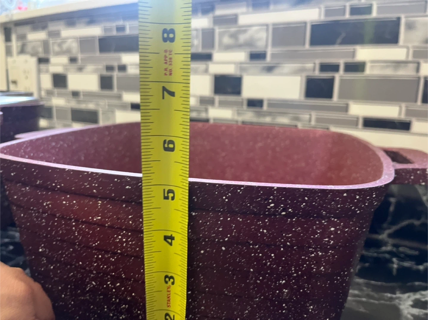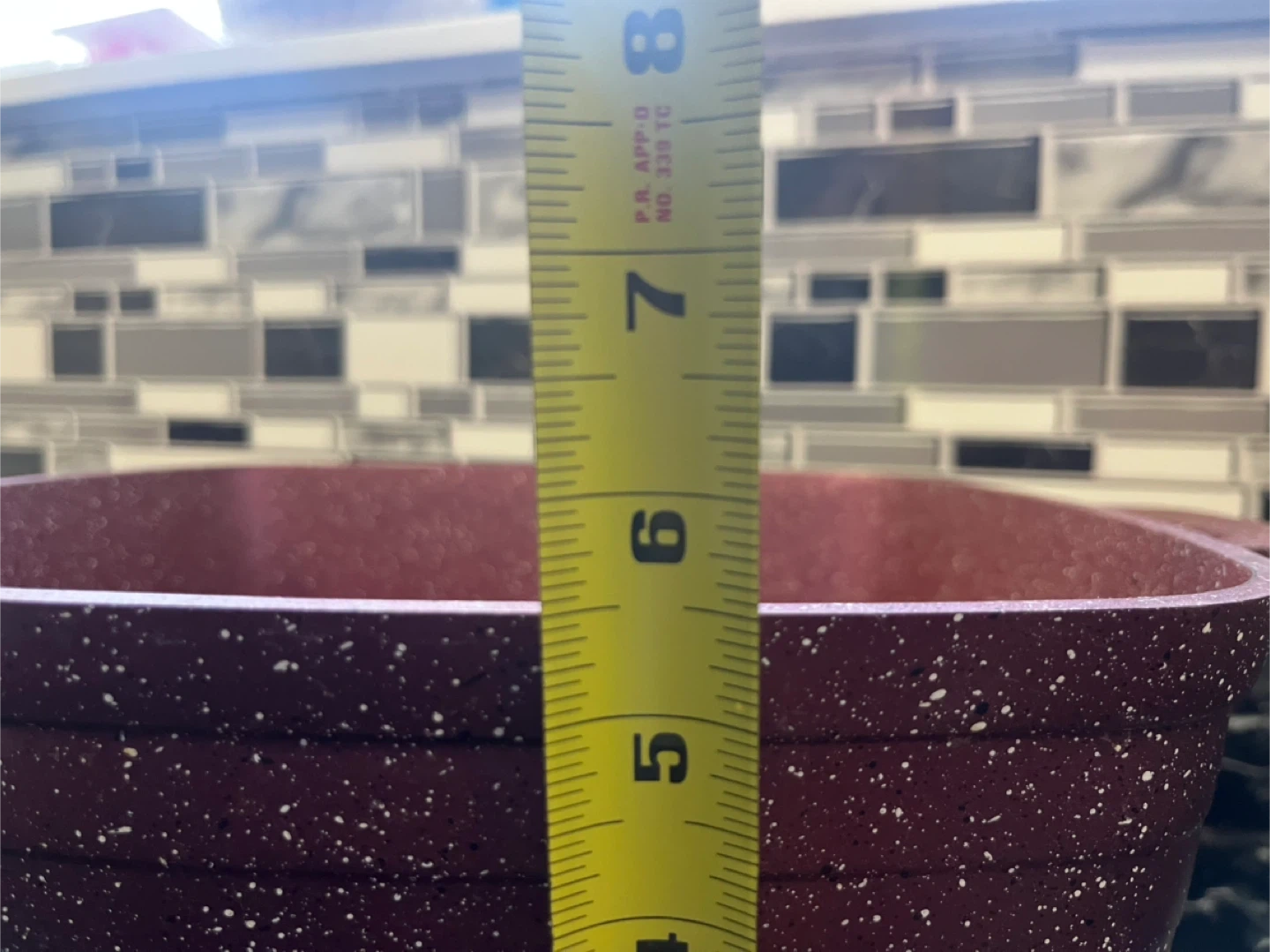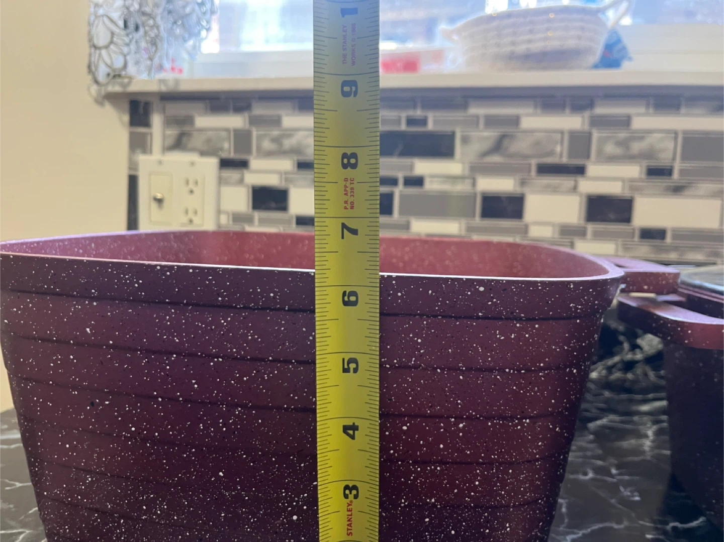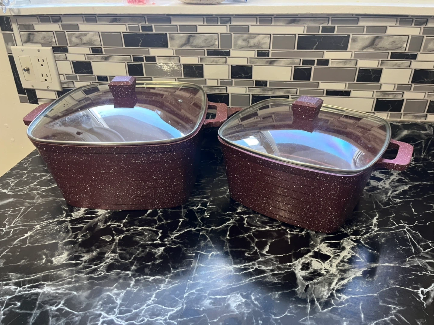 This set includes two square cookware pots with clear glass lids. The pots are a speckled deep red colour. Approximate dimensions for the larger pot are 11 inches wide and 6 inches deep. The smaller pot is approximately 9 inches wide and 5 inches deep. These pots are great for everyday cooking tasks!
