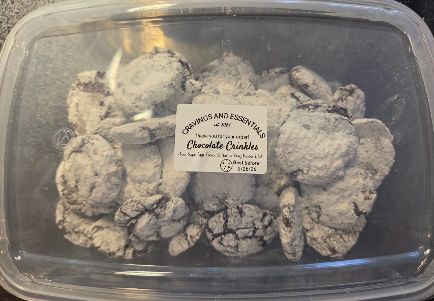 Cravings and Essentials Chocolate Crinkles are a tasty treat. Ingredients include flour, sugar, eggs, cocoa, oil, vanilla, baking powder, and salt. Best before 2/26/26.