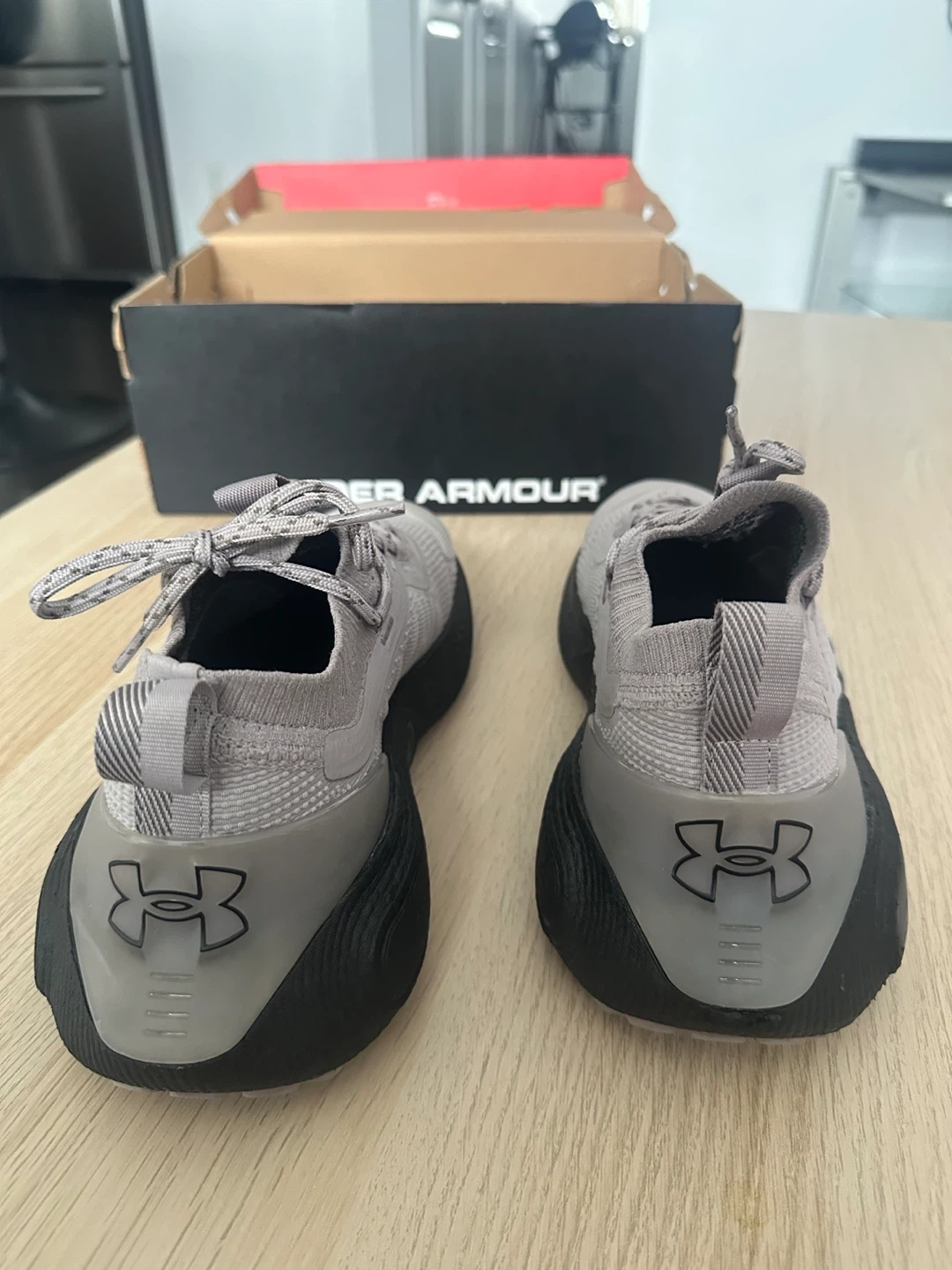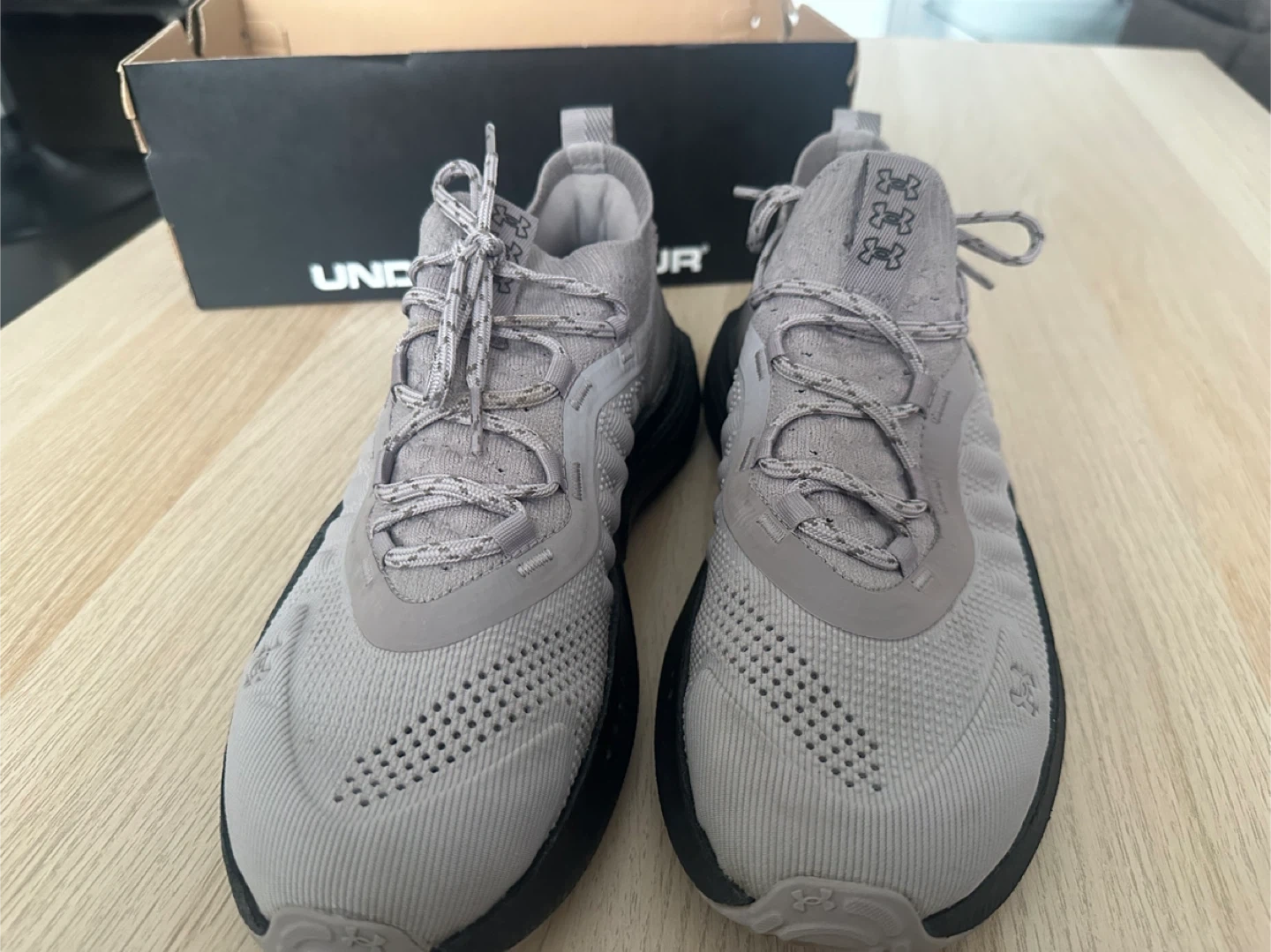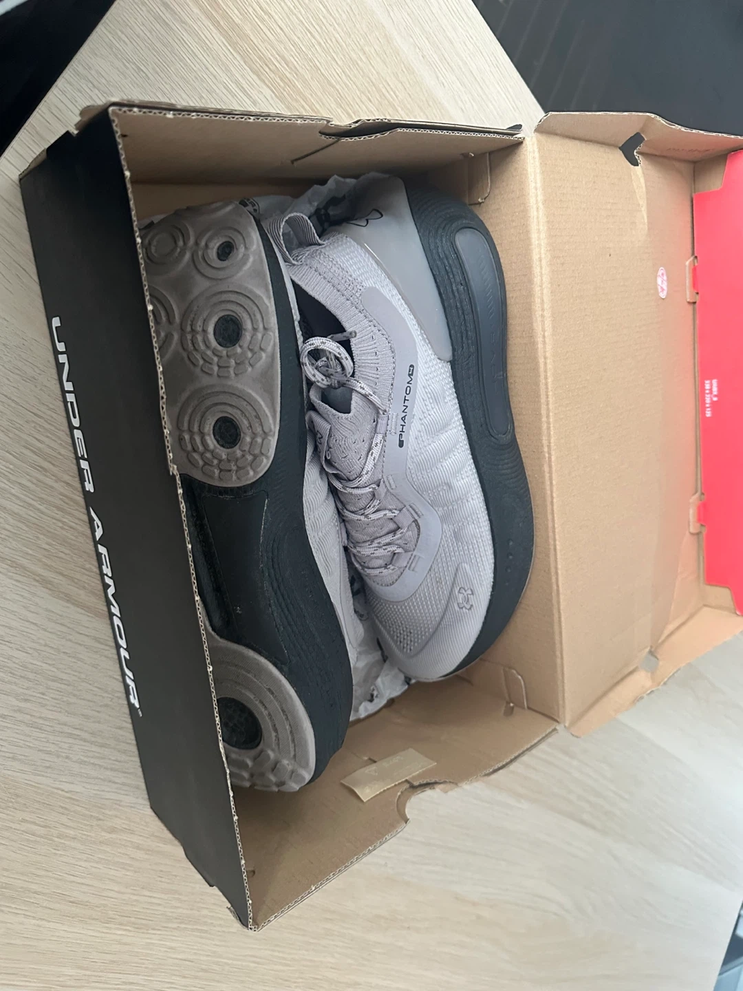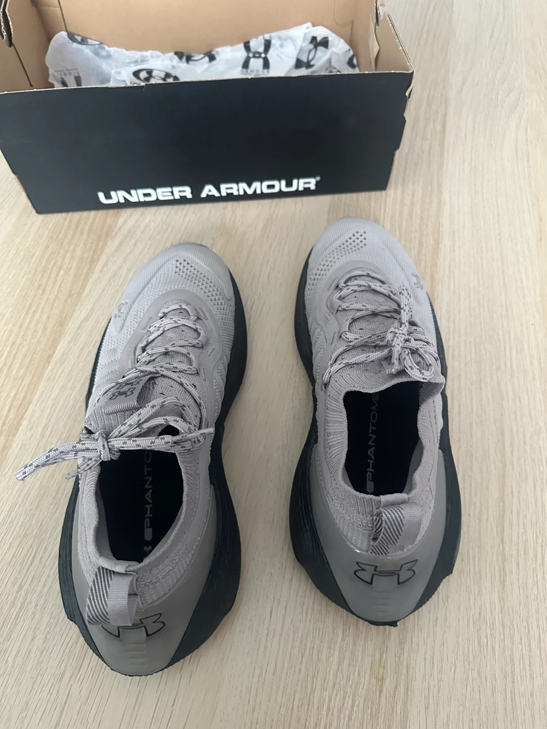 These Under Armour running shoes are grey with a black sole. They come with the original box. The Phantom model offers a comfortable fit for your runs!