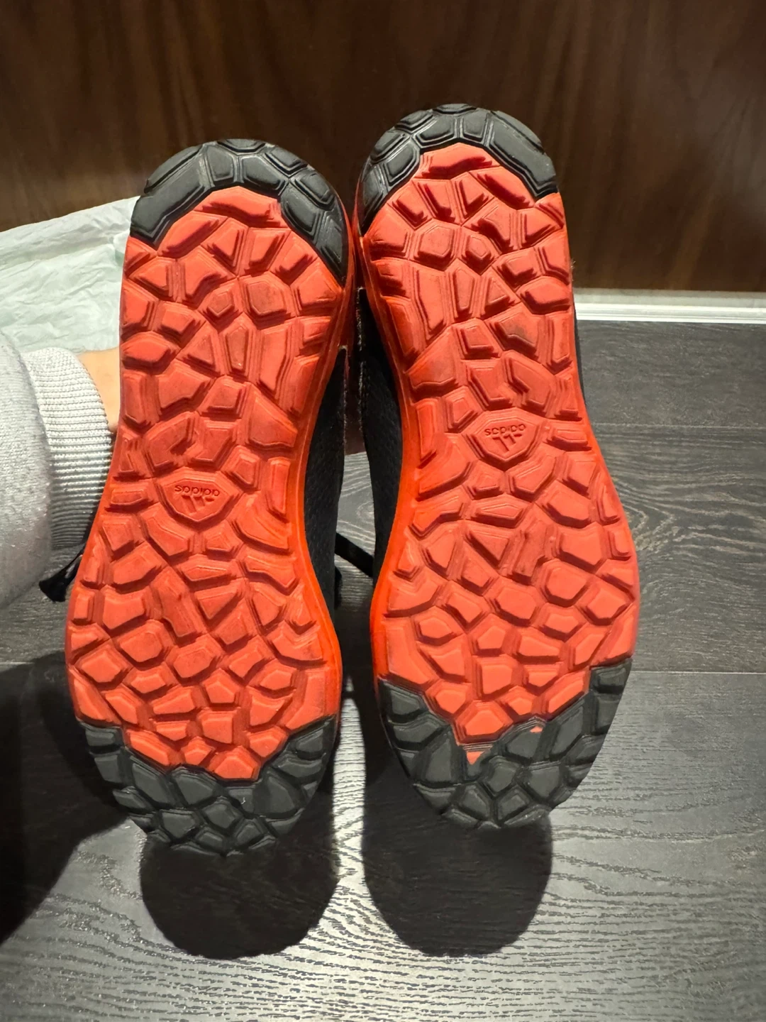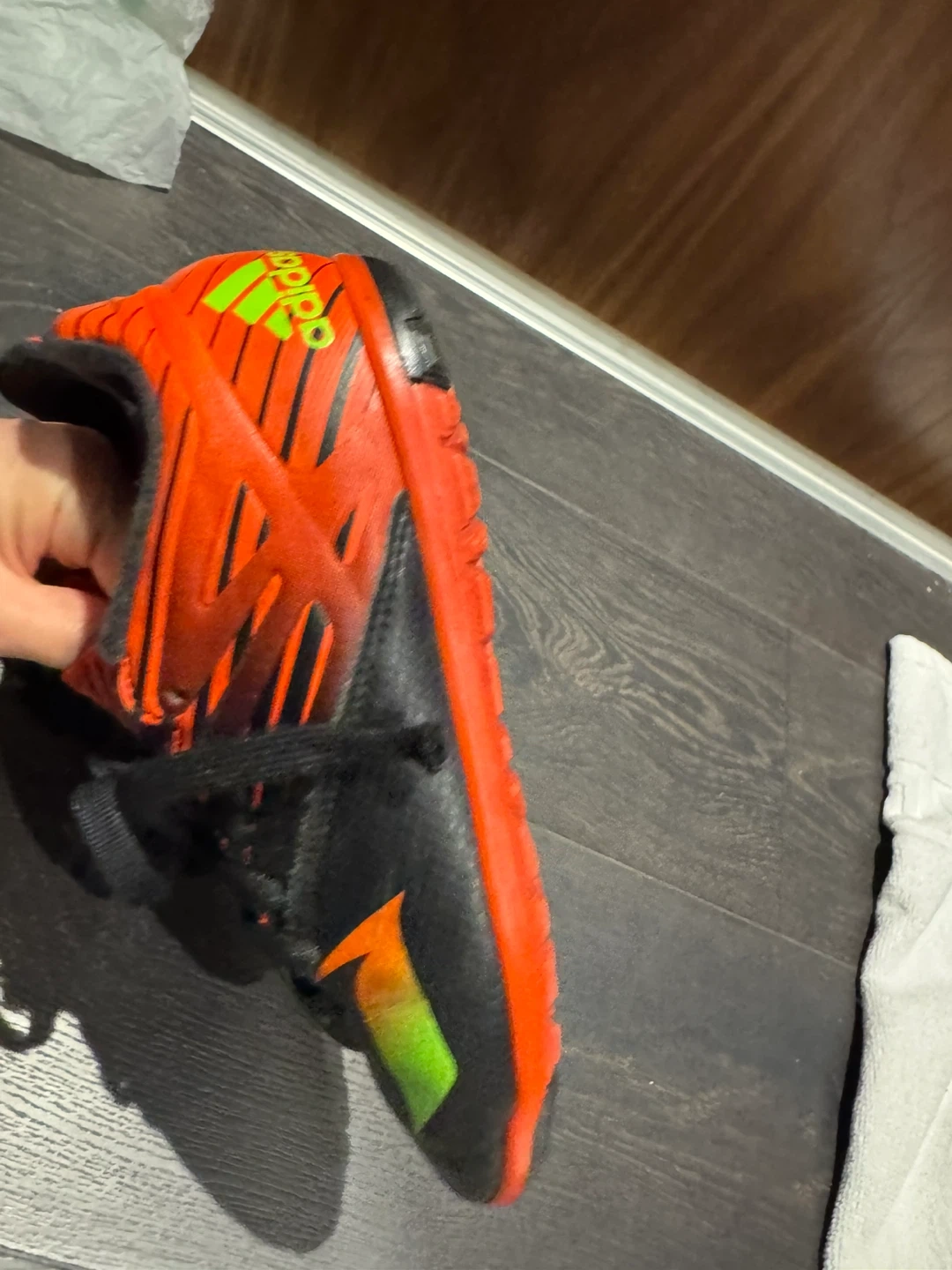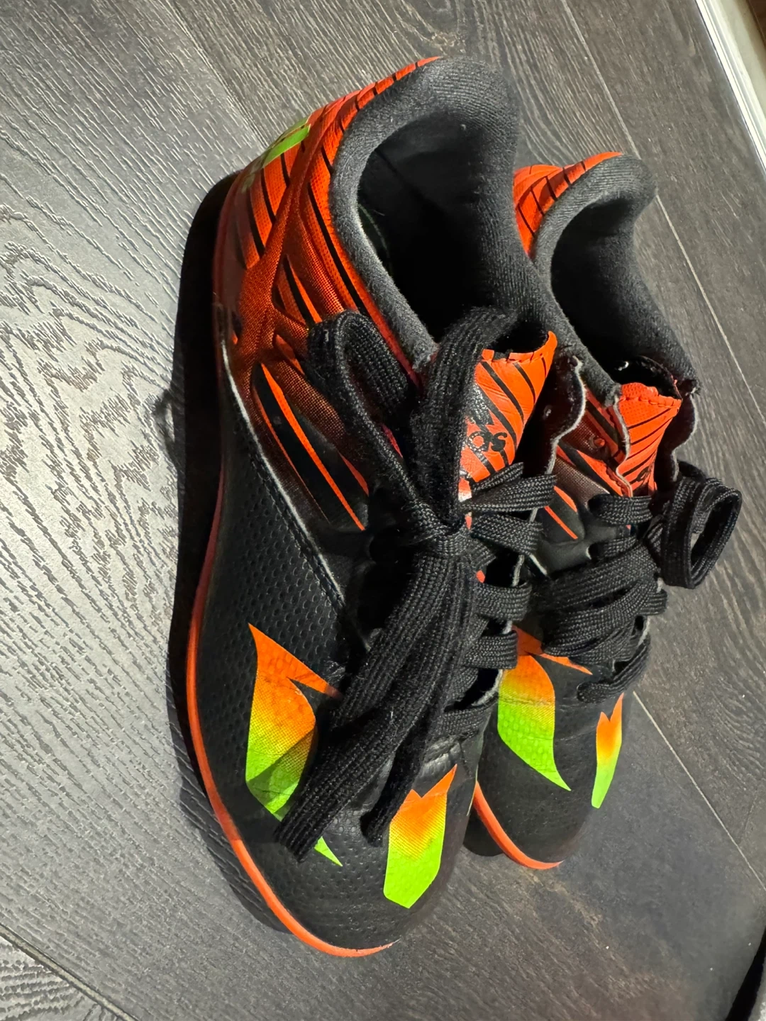 Selling a pair of Adidas Messi 16.4 TF soccer shoes. They're in good condition and ready for the field! The shoes feature a black, orange, and green colour scheme, with the Adidas logo clearly visible. Great for young soccer players
