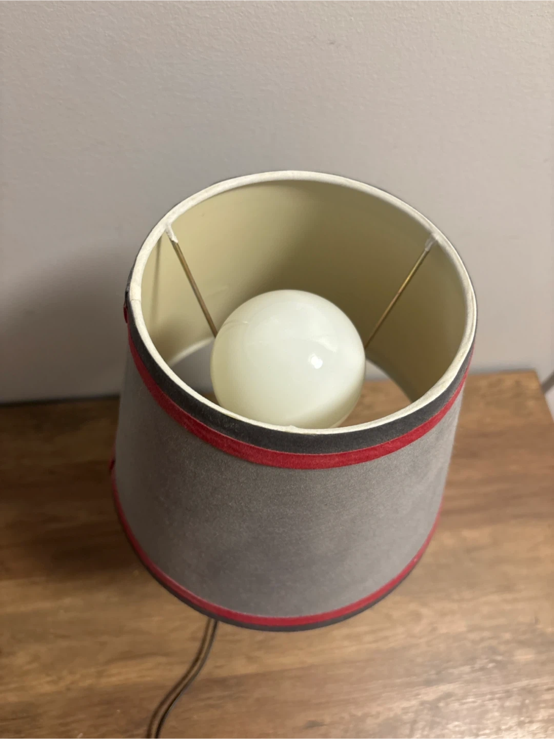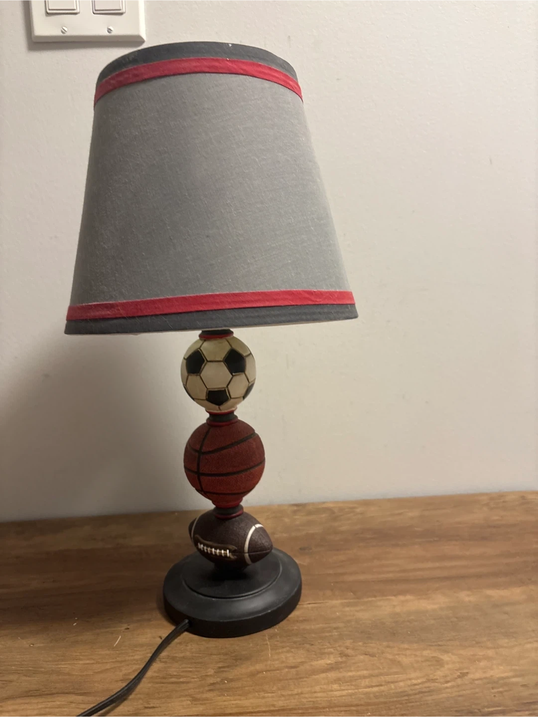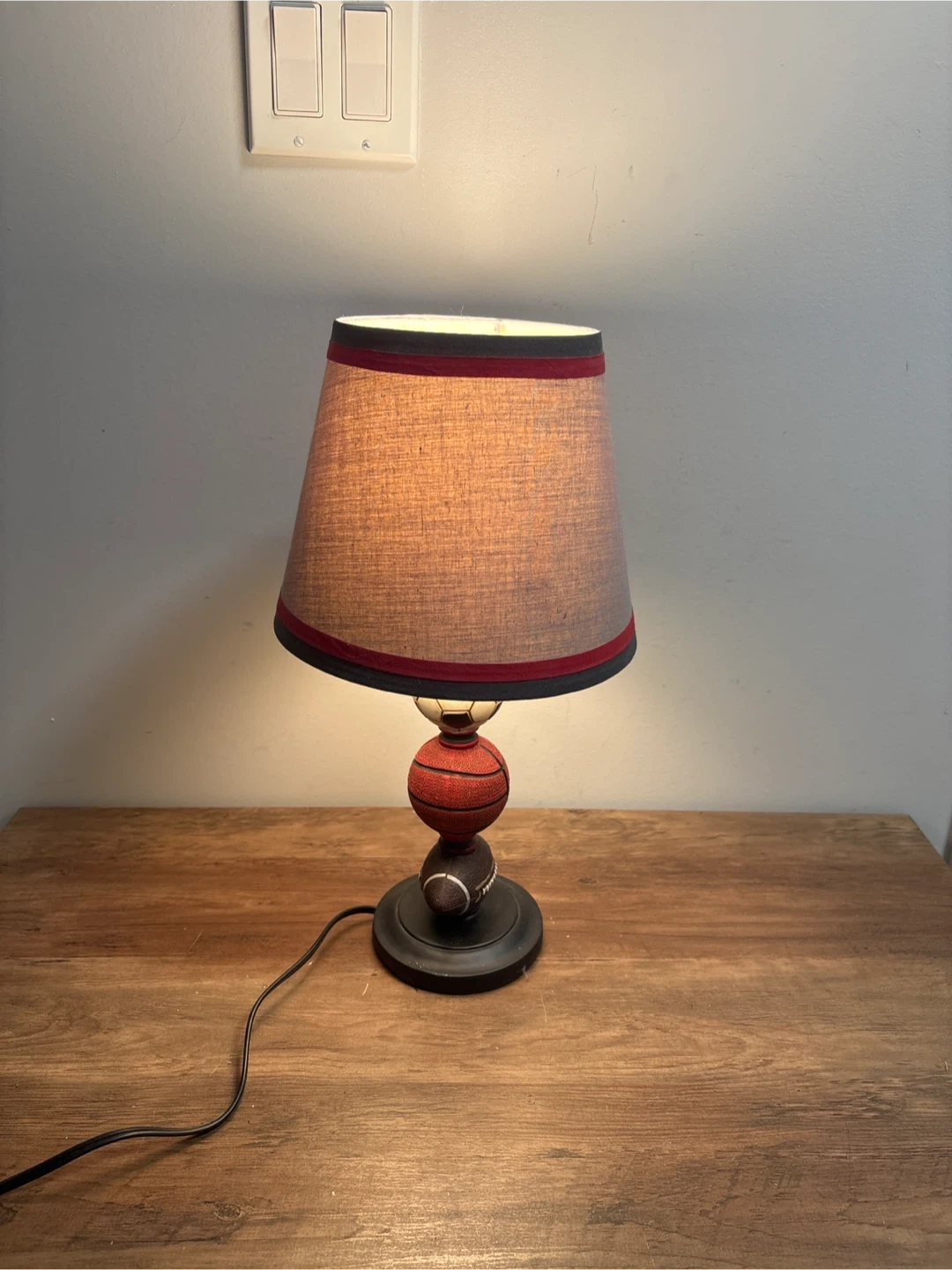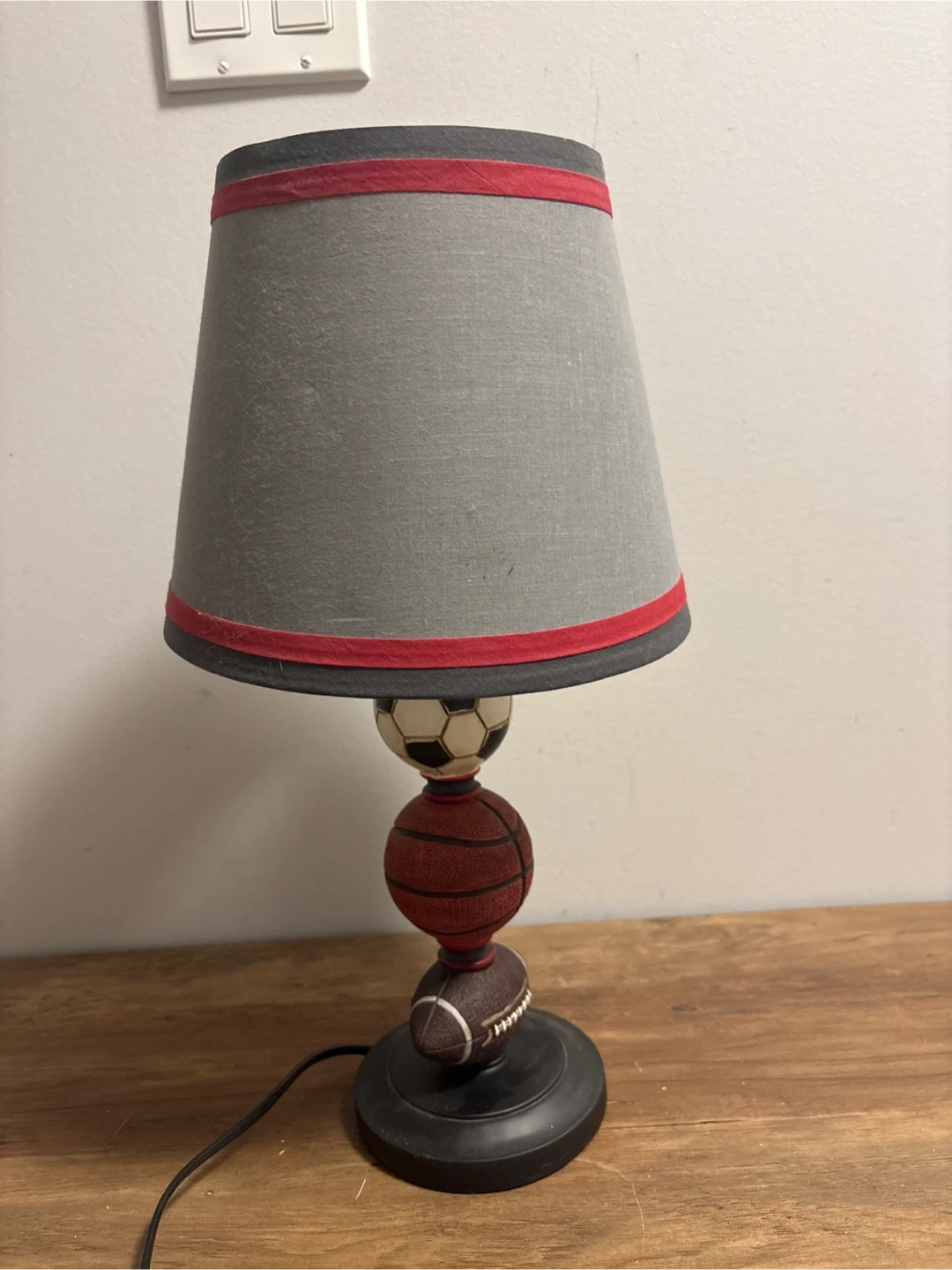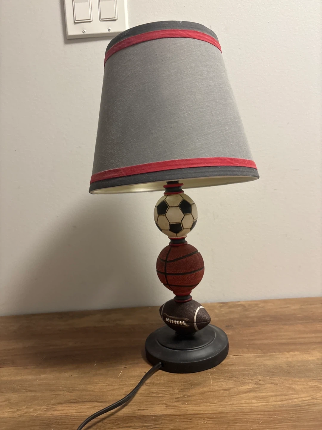 This fun table lamp features a lampshade with red and grey trim. The base is designed with stacked sports balls: a soccer ball, a basketball, and a football. It's a great addition to a kid's room or a sports fan's space!