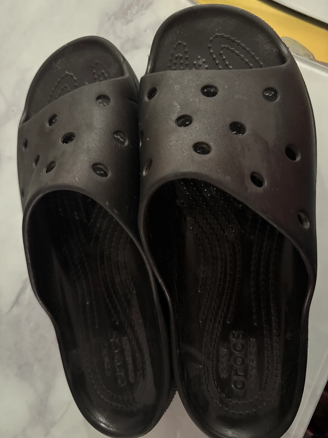 Selling a pair of black Crocs slides in women's size 9! They're in good condition and ready for a new owner