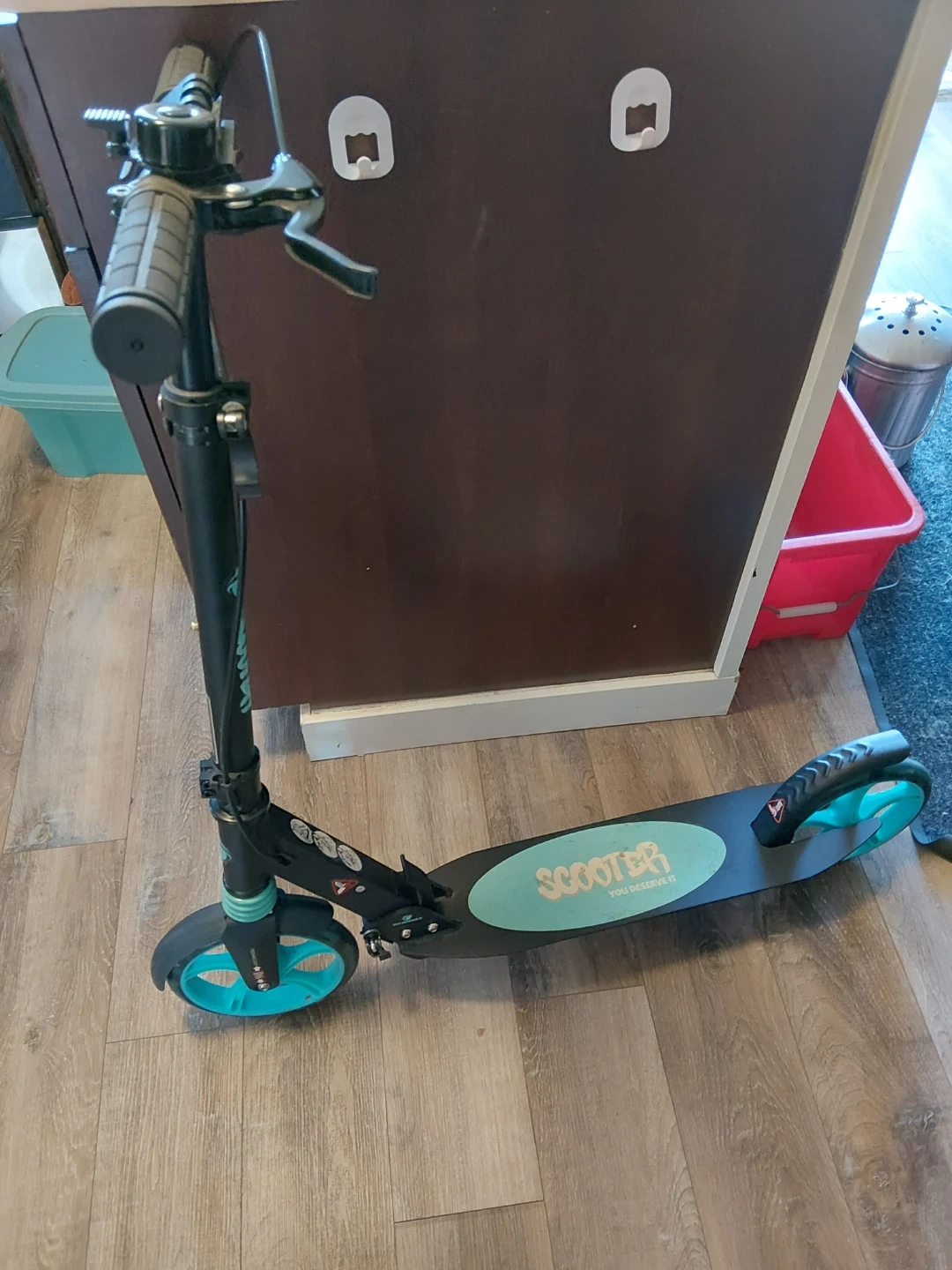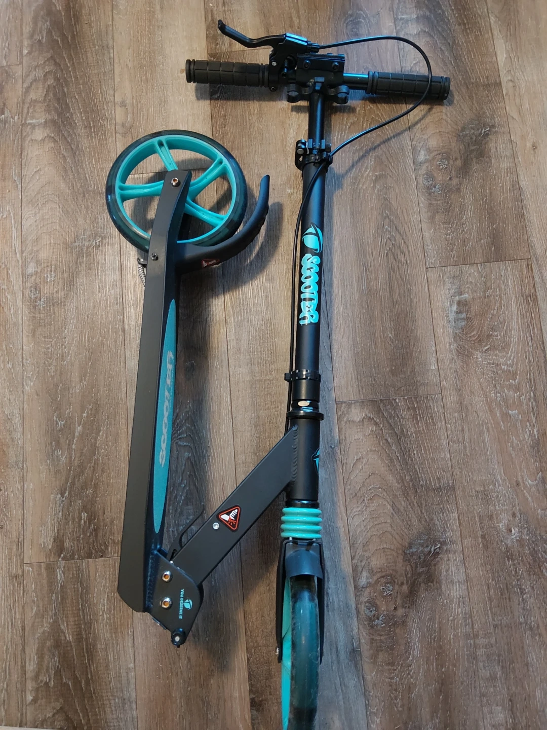 This folding scooter is black with teal accents. The handlebars are adjustable for a comfortable fit. Rated for 8+ including adults. Wheels light up. I only rode it a few times.
