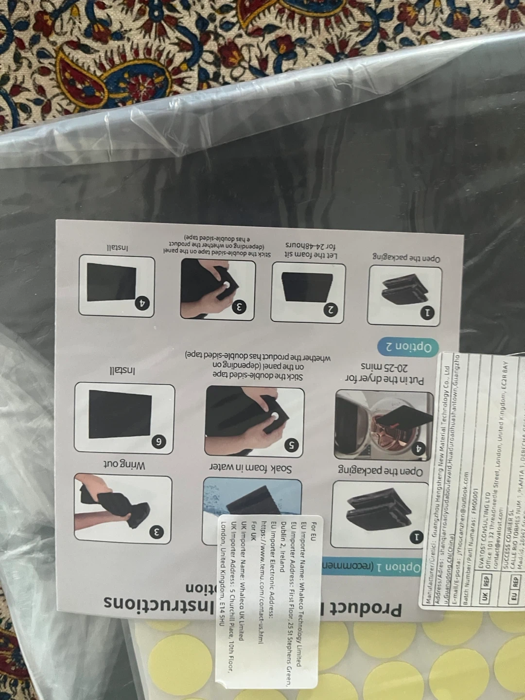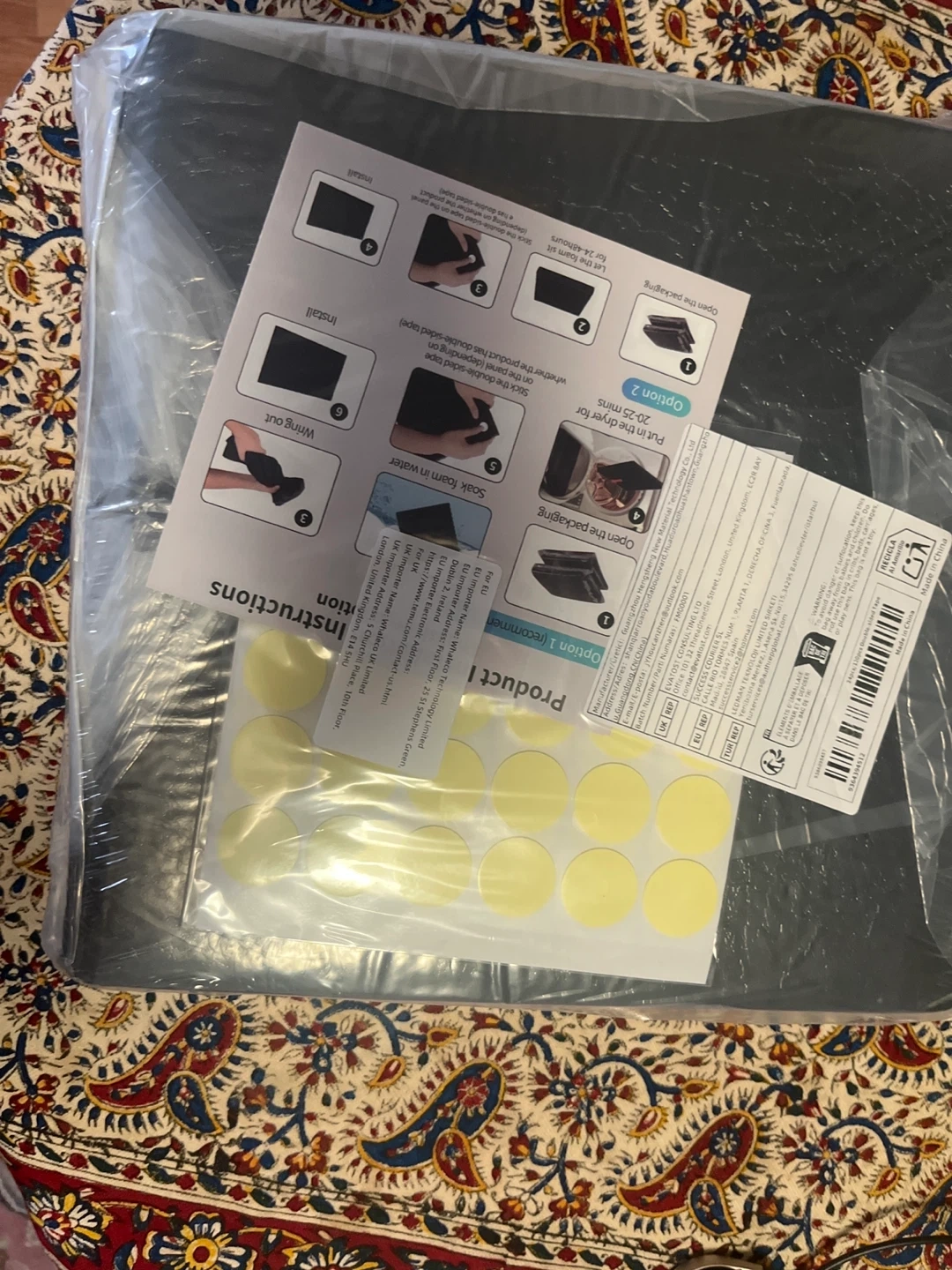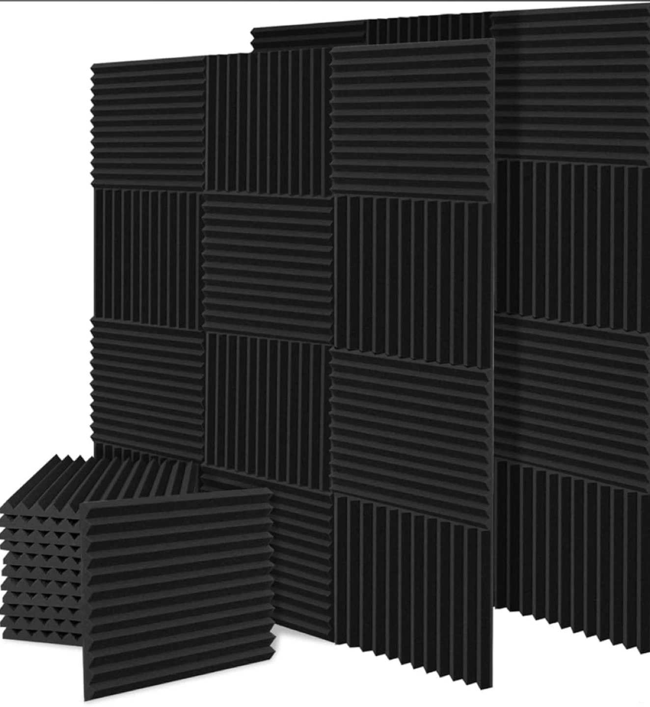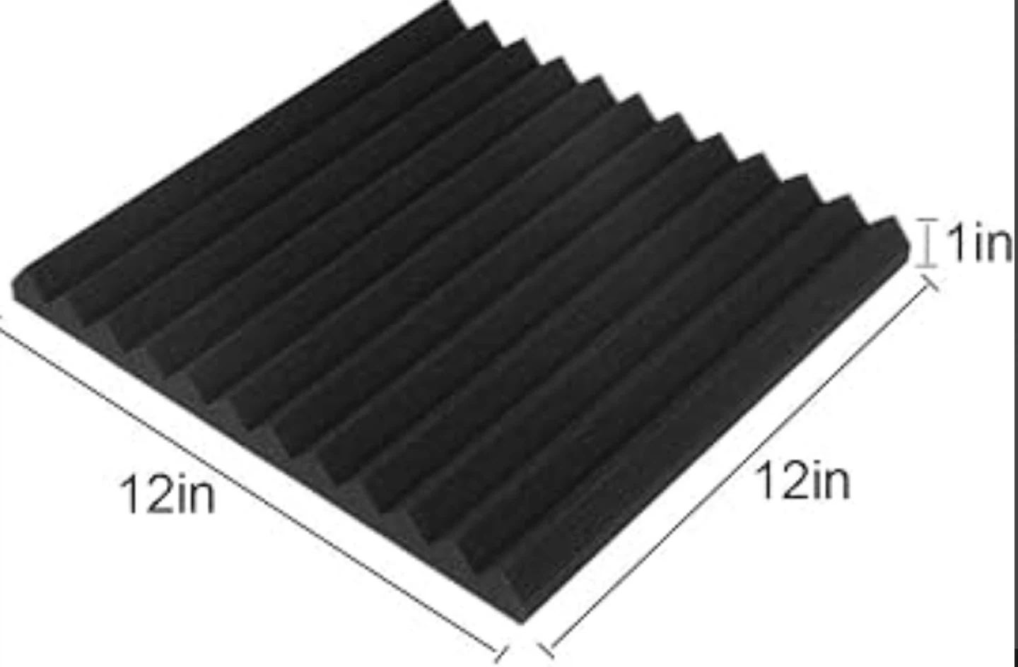 Set of black acoustic foam panels. Each panel measures 12 x 12 inches with a 1-inch thickness. Includes adhesive dots for mounting.
