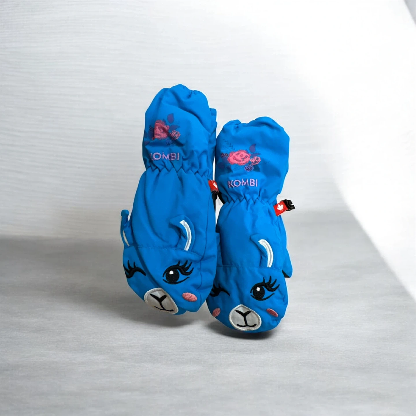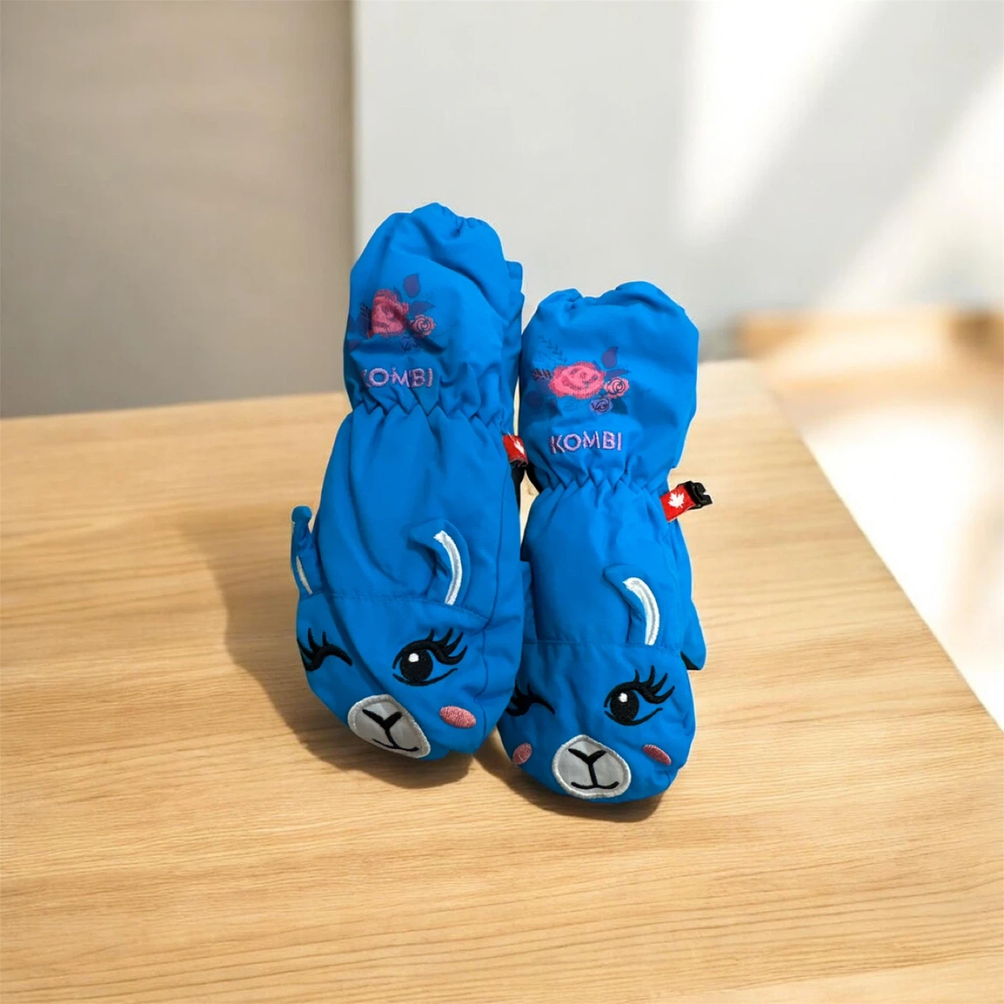 Kombi blue mittens featuring a cute bear face design. These mittens are made for kids and are perfect for keeping little hands warm.