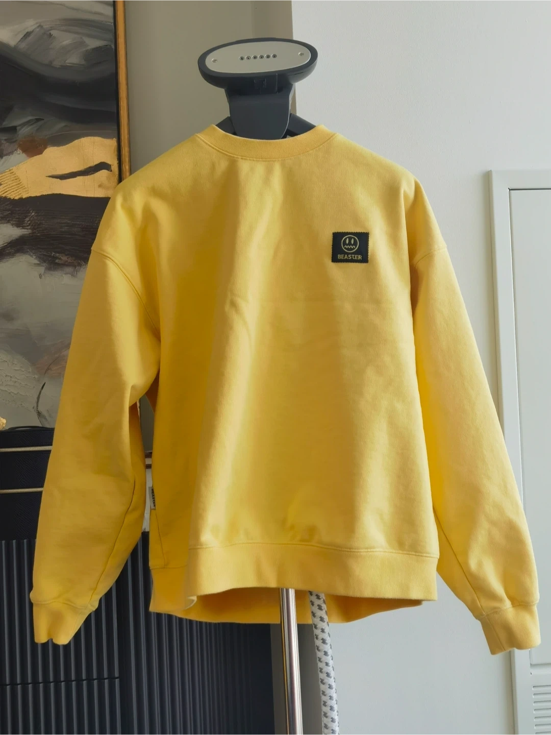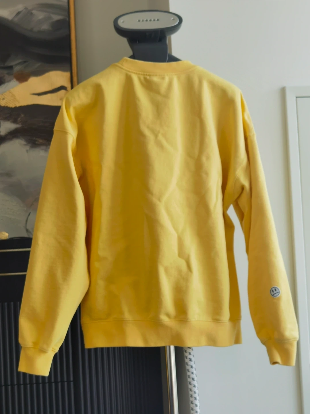 A cheerful yellow crewneck sweatshirt from Seaster. It features a small smiley face patch on the left chest and a subtle matching detail on the sleeve. This comfortable sweatshirt is perfect for casual wear.