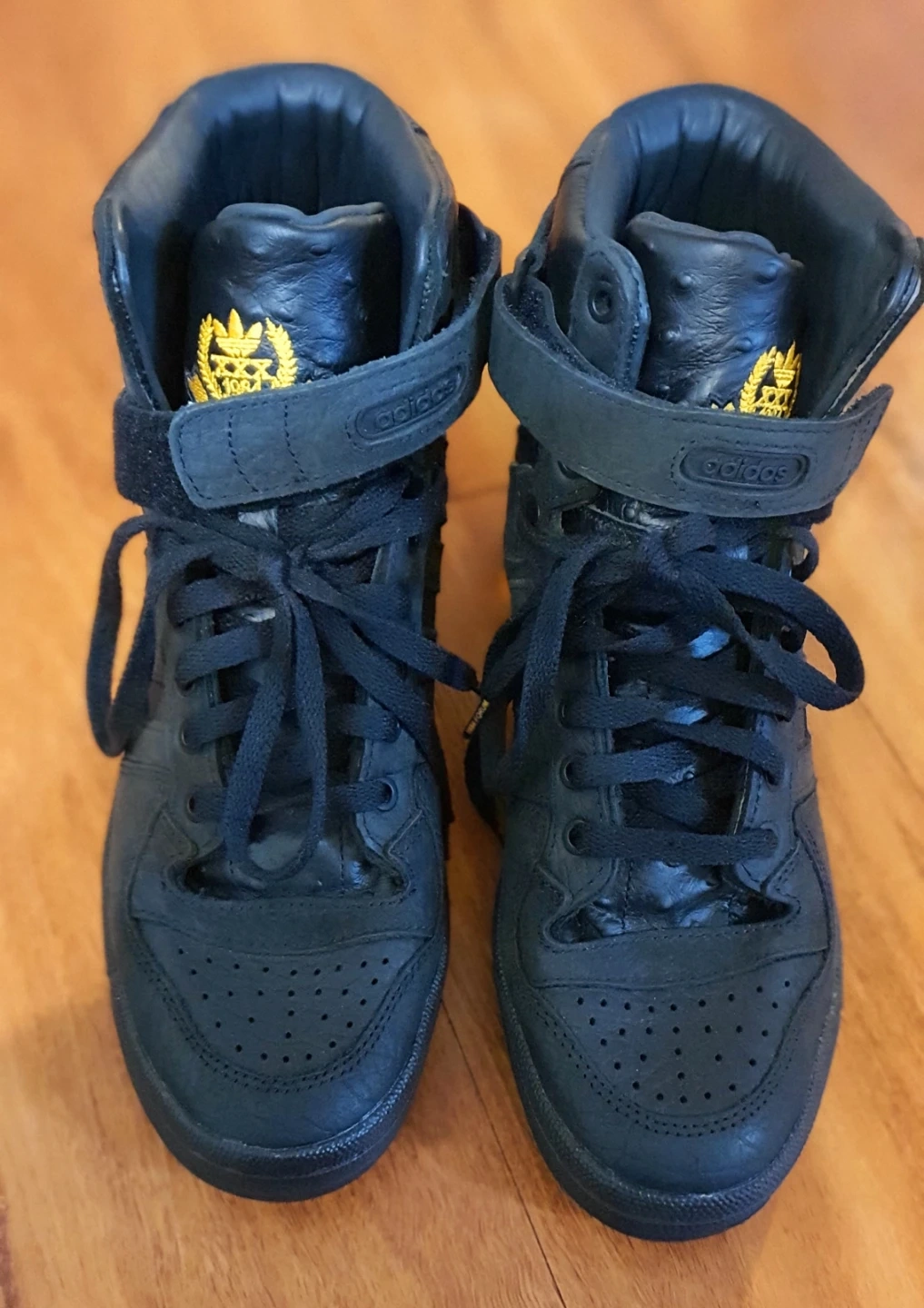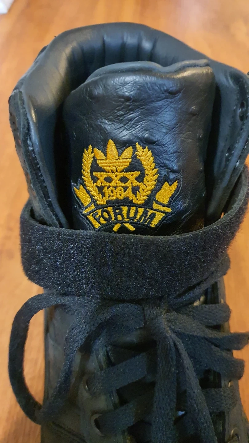 Black Adidas Forum high top sneakers. Lace-up closure with adjustable ankle strap. Leather material.