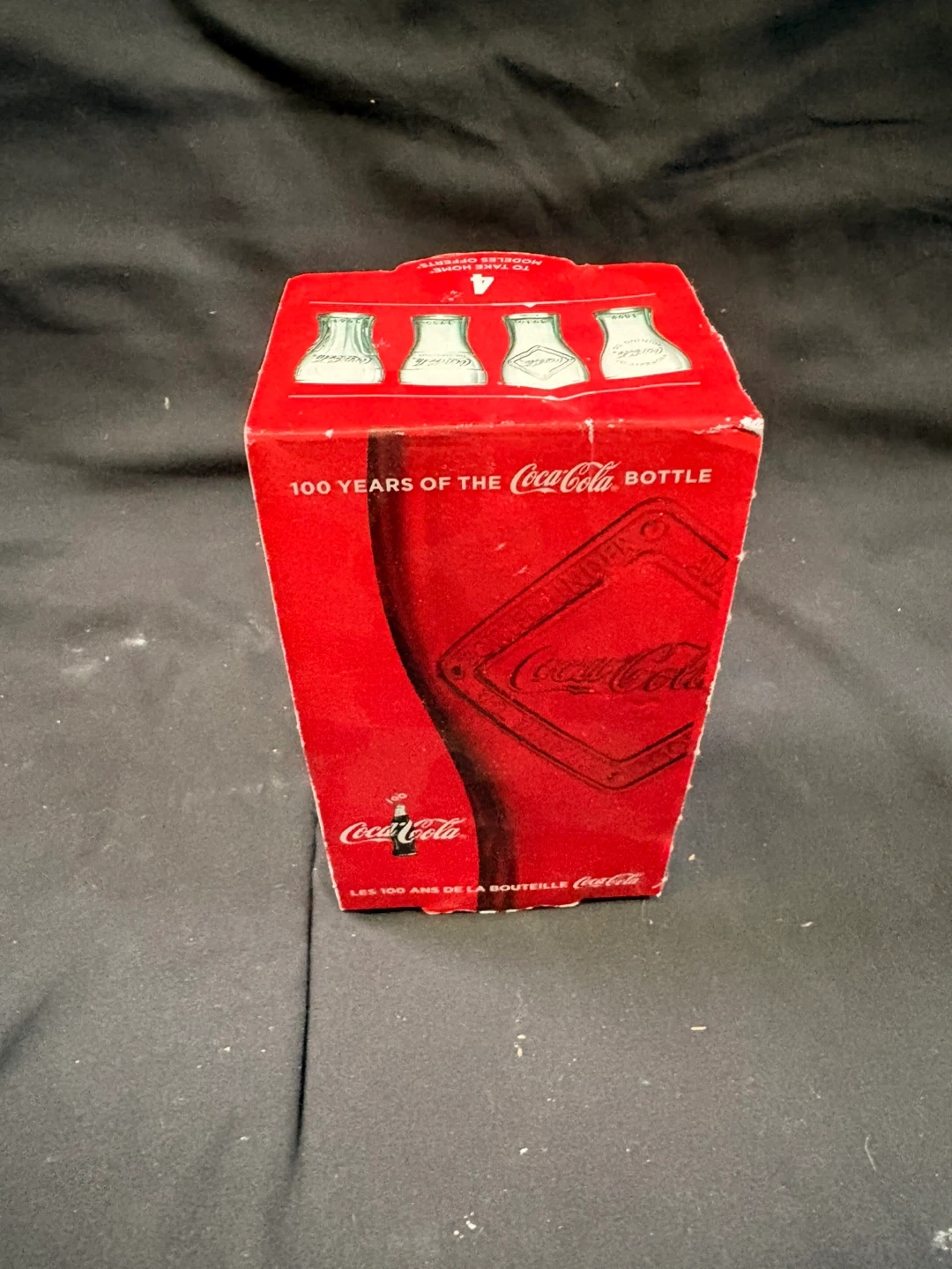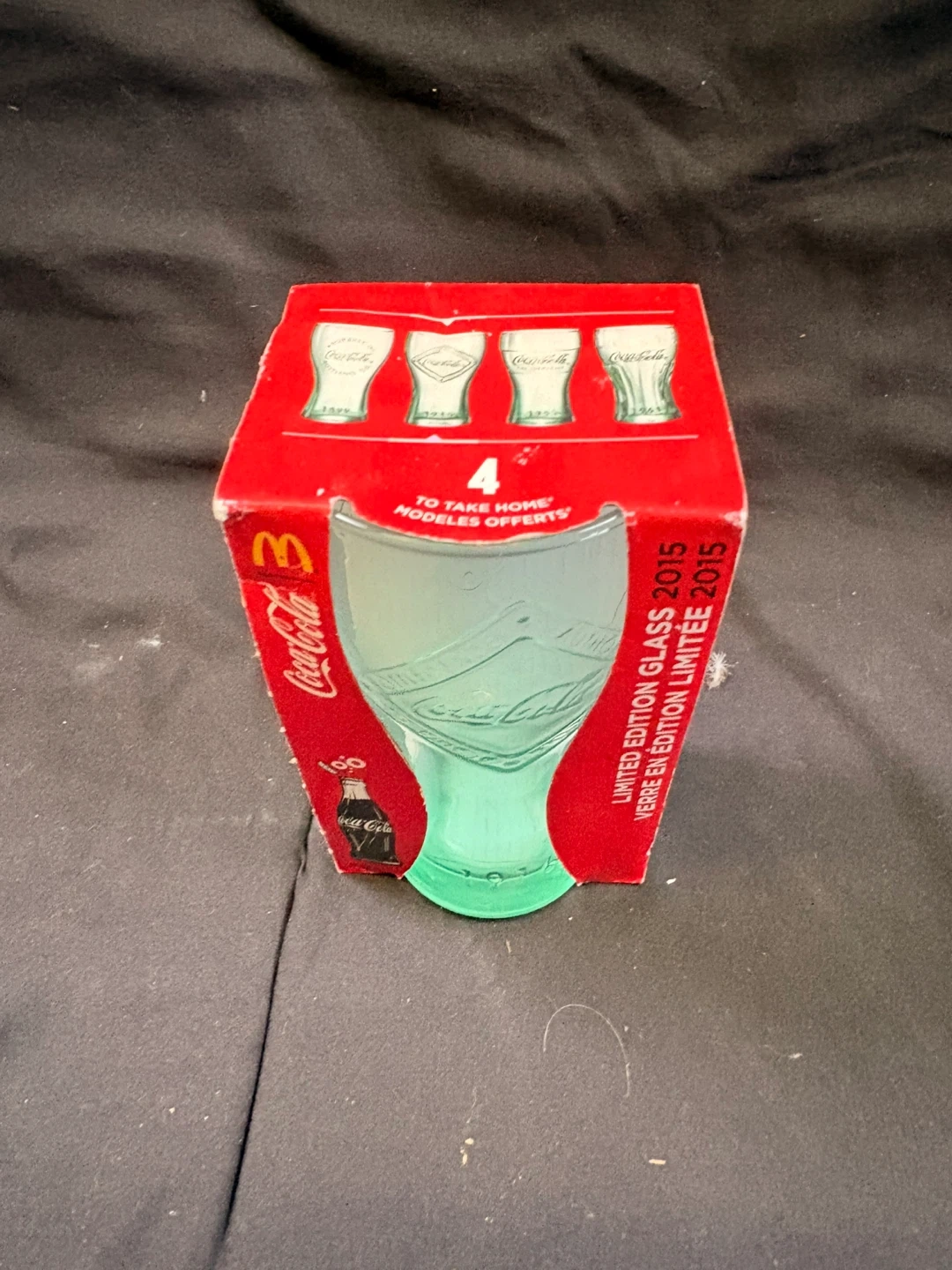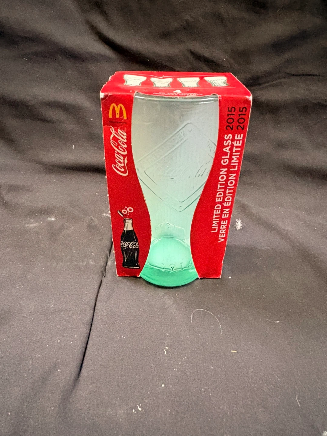 A Coca-Cola limited edition glass from 2015, celebrating 100 years of the Coca-Cola bottle. This glass features a green tint. It comes in it’s original packaging.
