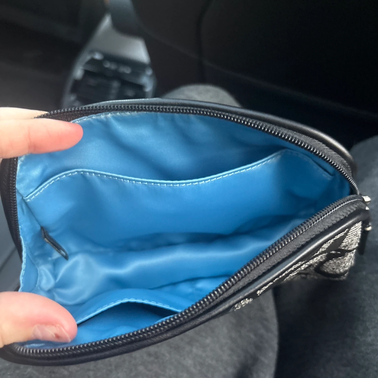 Coach cosmetic pouch with signature C pattern. It features a zippered closure and a bright blue interior lining with multiple pockets. Perfect for organizing makeup or small essentials.