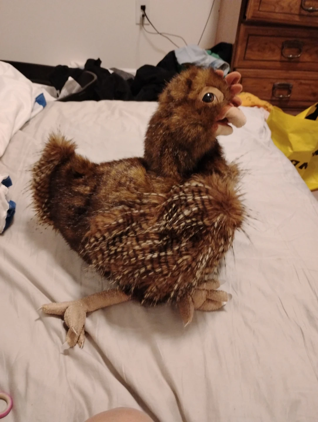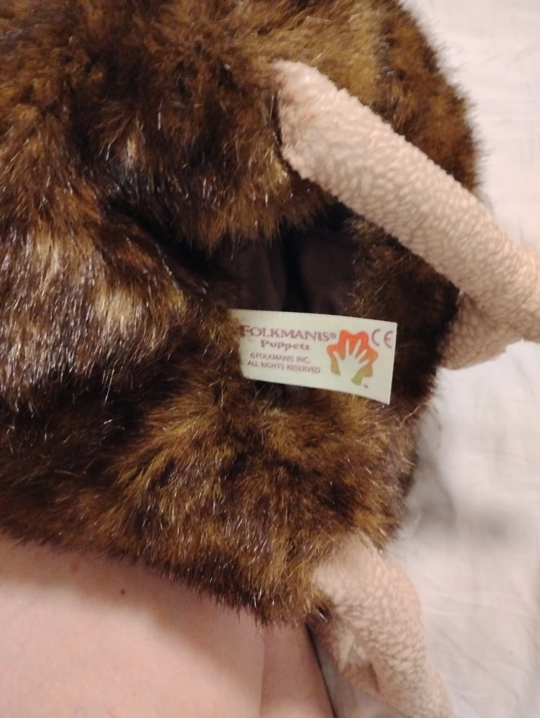 This is a Folkmanis chicken puppet! It's in great condition and ready for some fun puppet shows. The puppet is brown and features a realistic design. It's perfect for kids and adults alike!