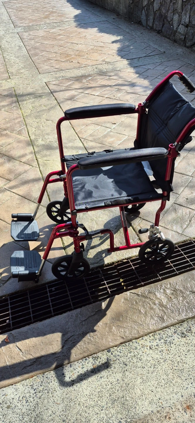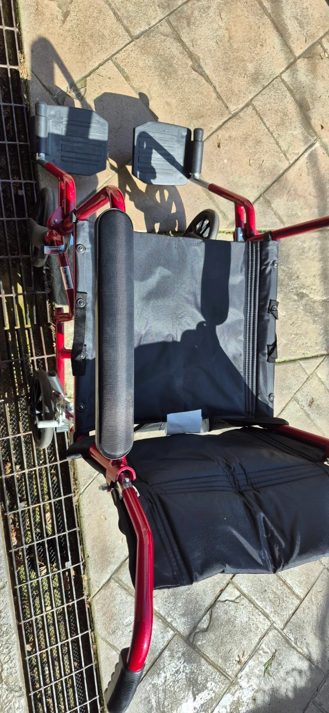 This red transport wheelchair is lightweight and easy to manoeuvre. It features padded armrests for comfort and flip-up footrests. It's designed for portability.