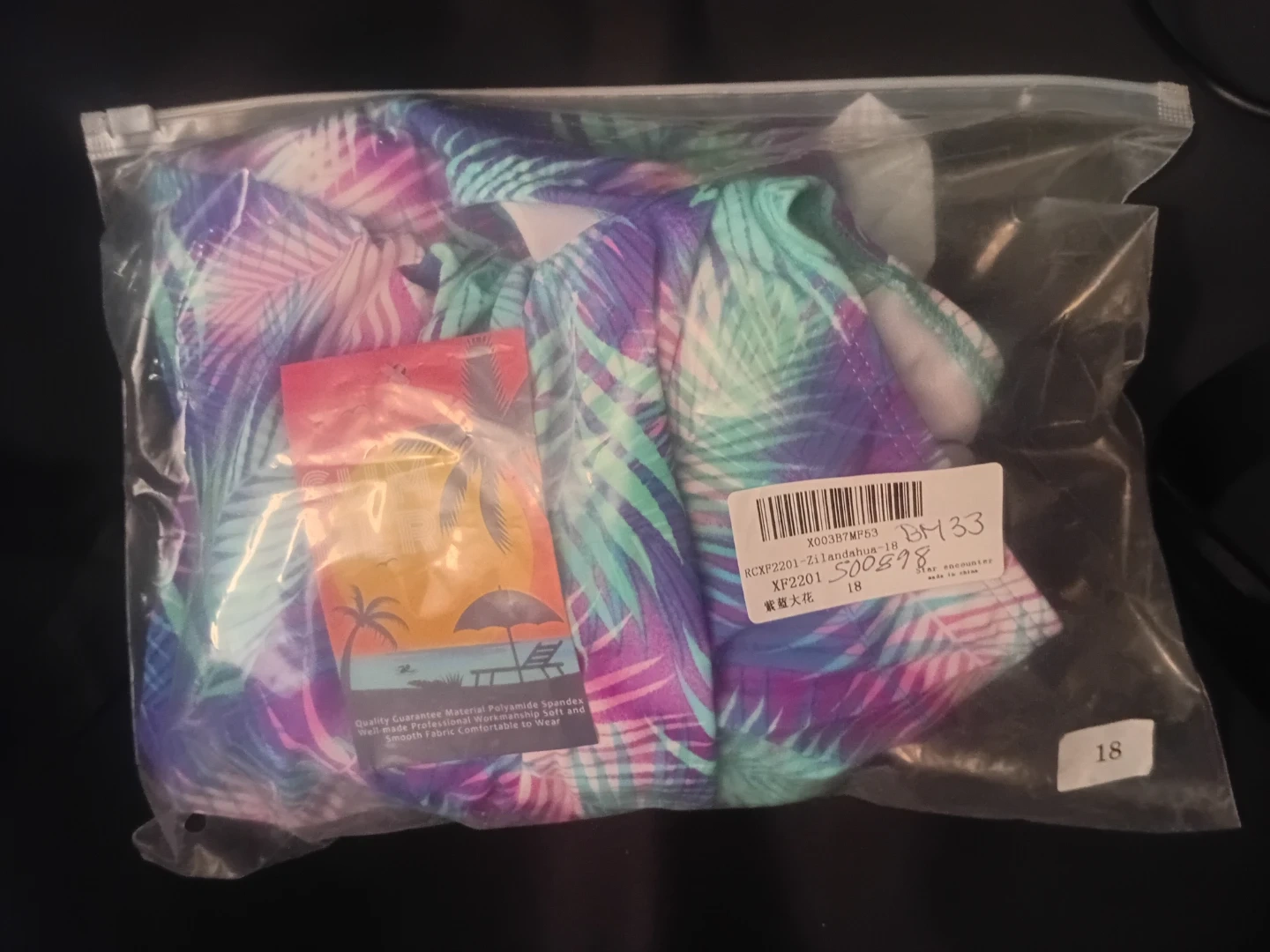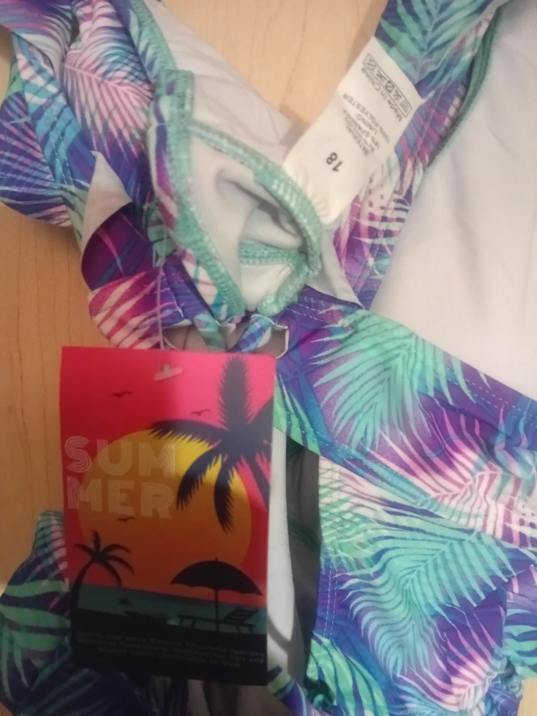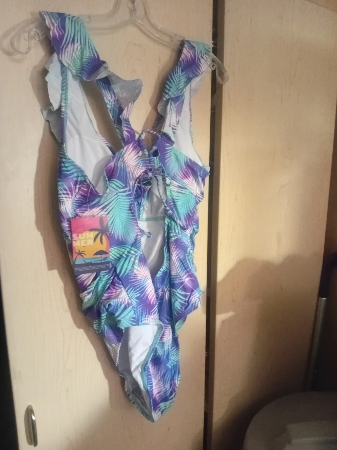 This one-piece swimsuit features a vibrant tropical leaf print with shades of purple, blue, and green. It has ruffled shoulder straps and a tie-back closure. Made from a blend of polyester and spandex for comfort and stretch.
