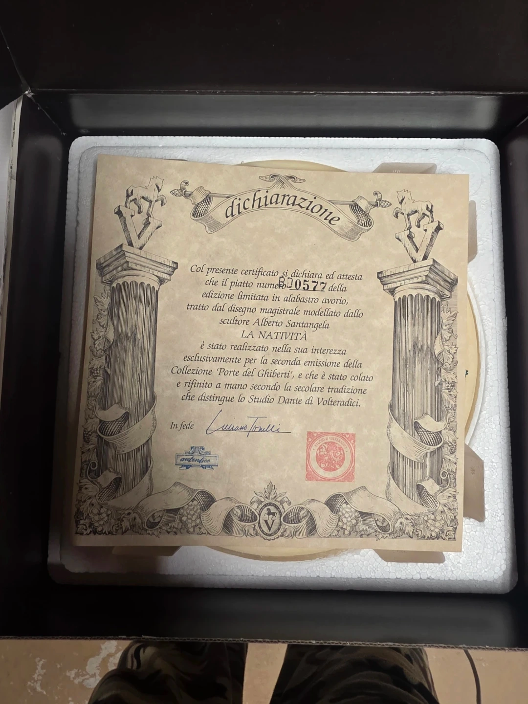 This is a "La Natività" relief plate sculpted by Alberto Santangela. It's part of a limited edition and comes with a certificate of authenticity. The piece depicts a Nativity scene with intricate details.