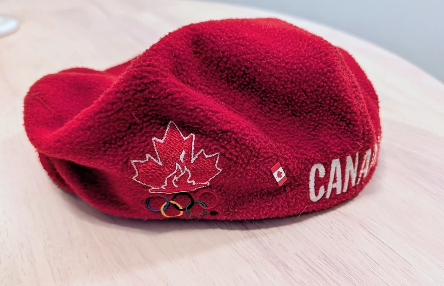 Red fleece flat cap with "CANADA" embroidered on the side, along with a Canadian flag accent. It also features the Canadian Olympic maple leaf logo. Made by Roots.