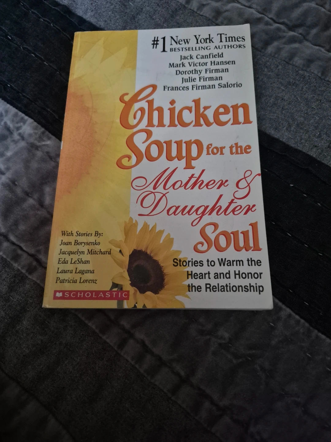 This book is "Chicken Soup for the Mother & Daughter Soul." It features stories to warm the heart and honor the relationship. Stories by Joan Borysenko, Jacquelyn Mitchard, Eda LeShan, Laura Lagana, and Patricia Lorenz are included.