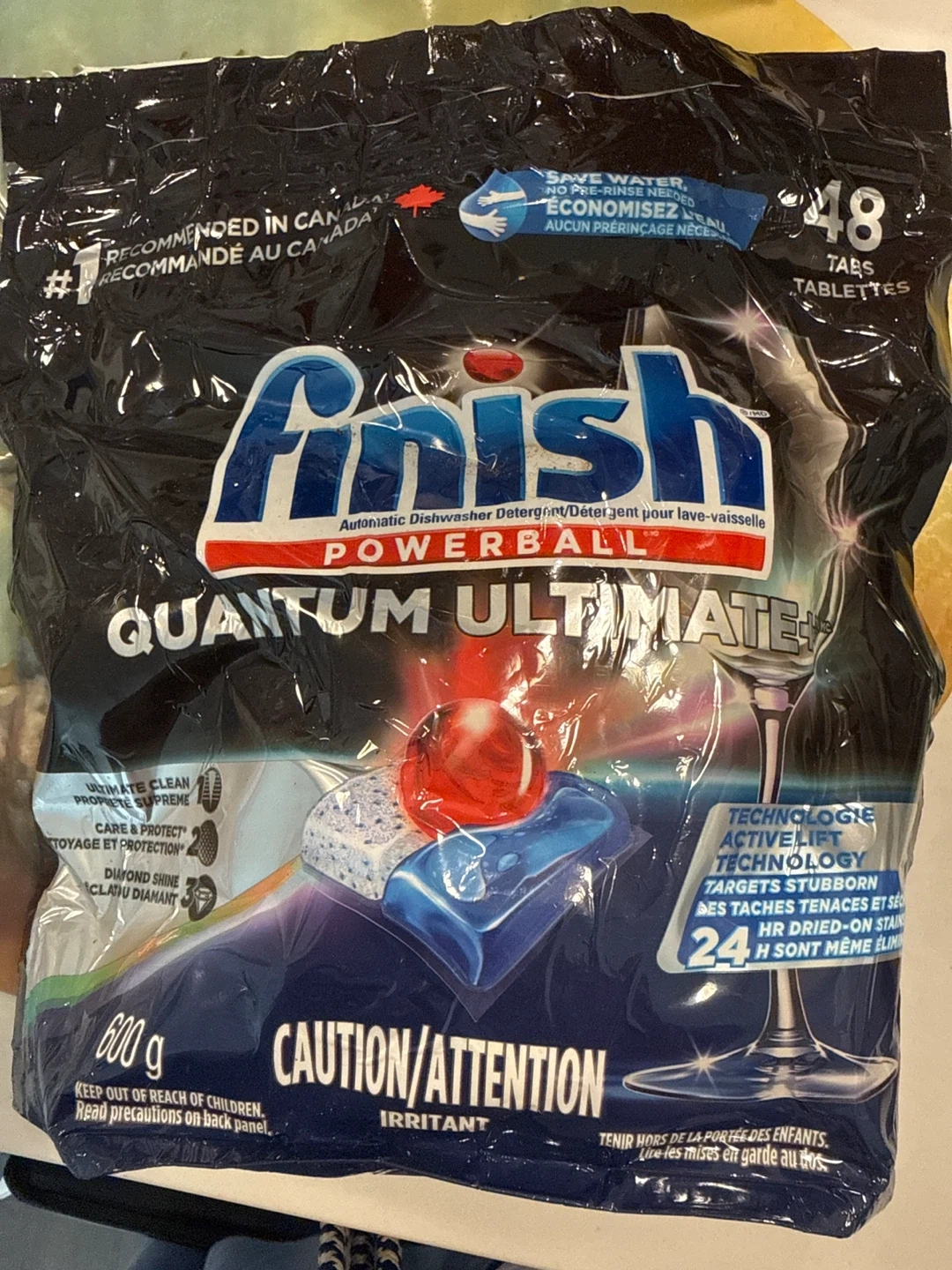 Finish Quantum Ultimate dishwasher detergent tabs in a 48-count package. Features Active Lift Technology to tackle stubborn dried-on stains. 600g bag.