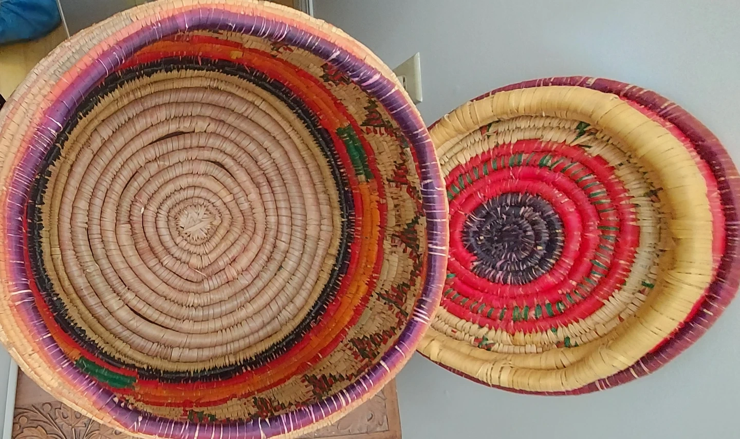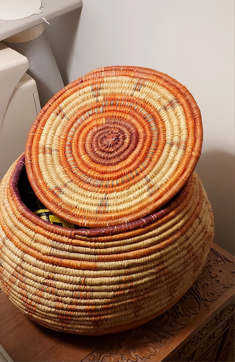 This hand-woven basket features a lid and a natural straw colour with orange and green accents. Woven in the Arabian peninsula with a suede-covered bottom, it's perfect for storing small items or as a decorative piece.