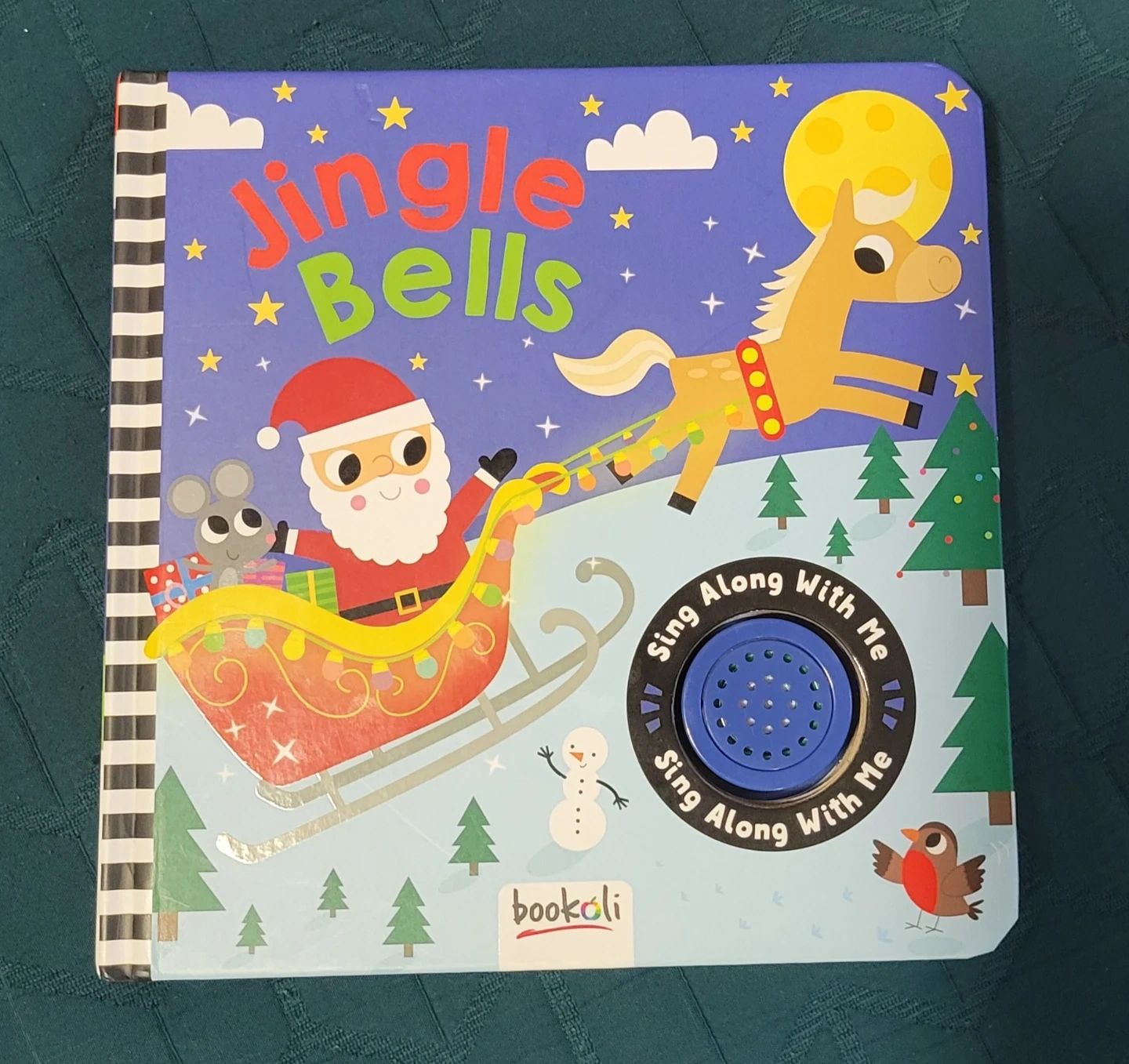 This Bookoli board book features the "Jingle Bells" song with interactive buttons. It's designed for little ones to sing along and has a durable cover. Requires 2 LR44 batteries, which are included, but need to be changed.