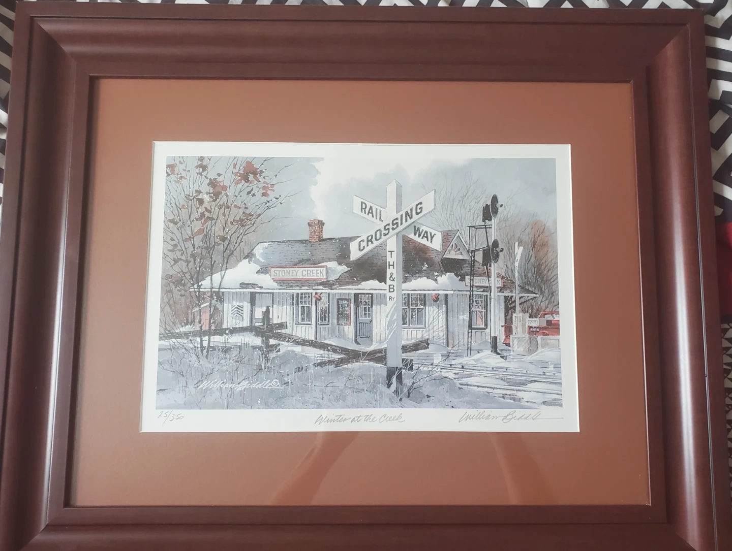 This is a framed art print titled "Winter at the Creek" by William Biddle. It's number 25 out of 350. The print depicts a snowy railway crossing with the Stoney Creek TH&B station. It's a lovely piece for any train enthusiast or collector!