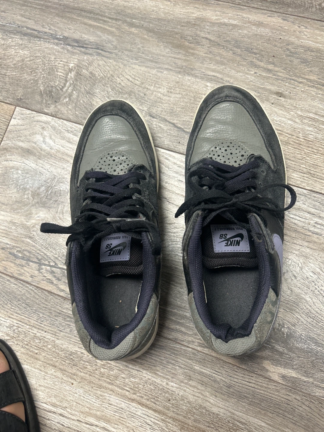 These are Nike SB Paul Rodriguez 7 skate shoes in a grey and black colourway. They're made with a suede and leather upper for durability. The tongue features a woven label with Nike SB branding. These shoes are perfect for skateboarding!