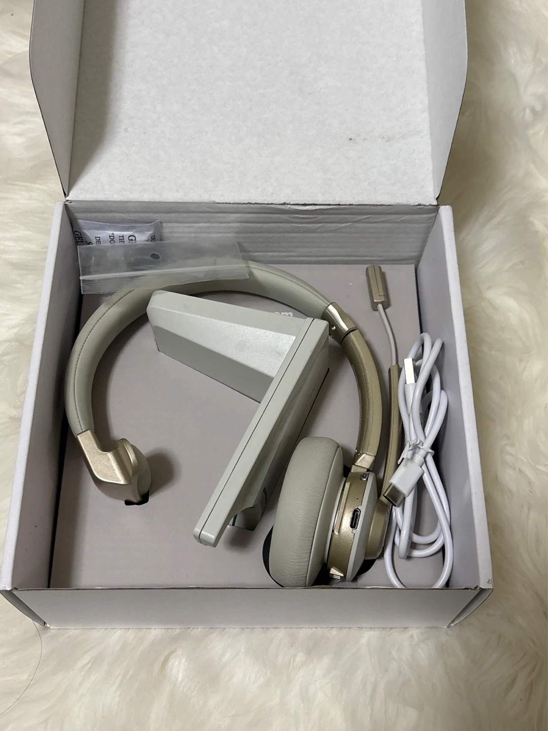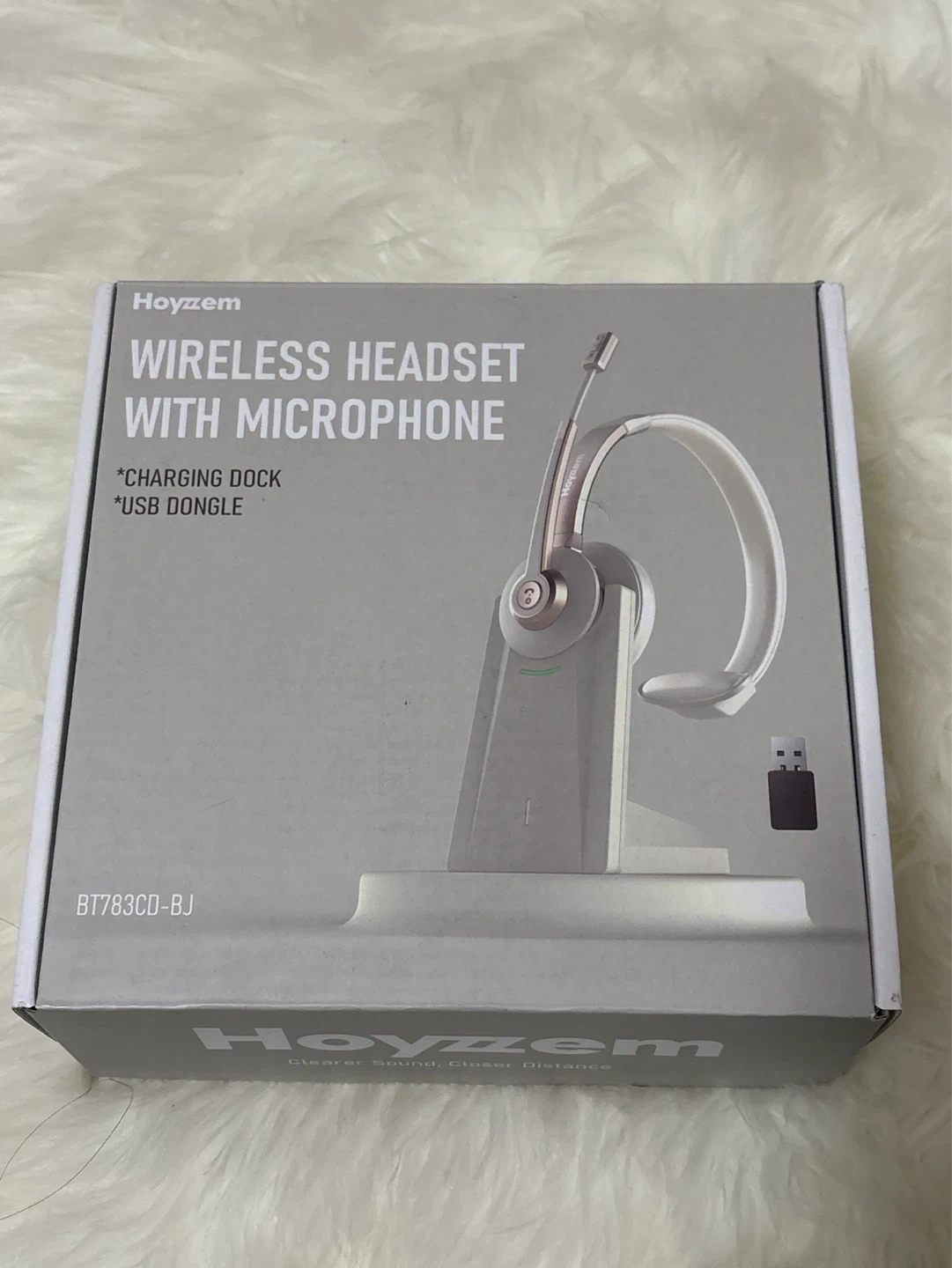 Hoyzem single-ear wireless headset. It features multipoint connection, noise cancelling mic, and quick mic mute. Includes charging dock and USB audio dongle. Wear left or right side.