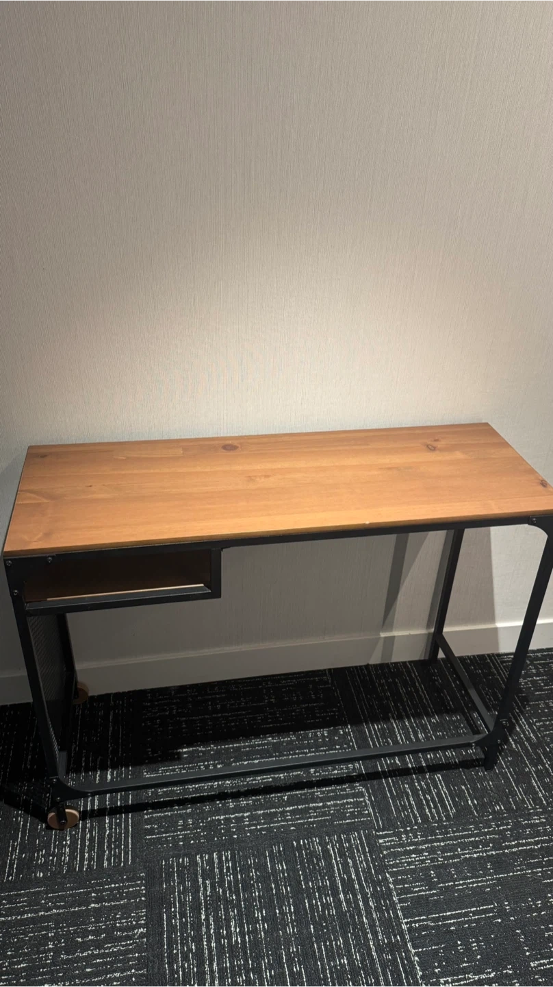 This console table features a natural wood top and a sturdy black metal frame. It includes a lower shelf for extra storage. Perfect for entryways or behind a sofa!
