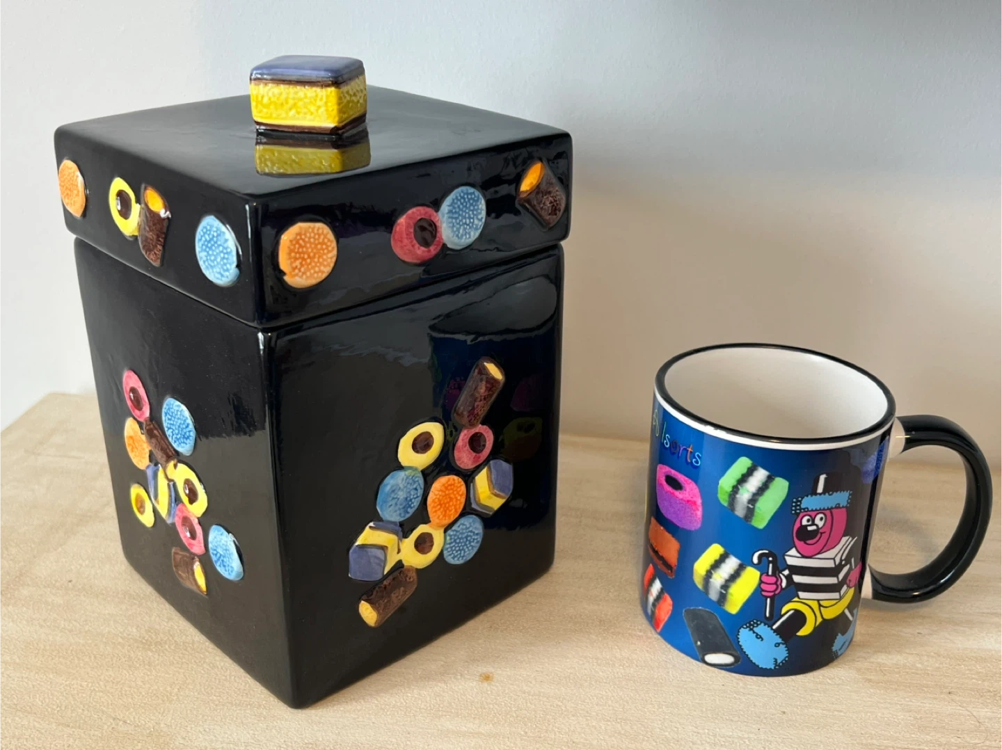 The jar is a black cube decorated with liquorice allsorts candies, and it comes with a lid. The mug is blue and also features liquorice allsorts designs. Perfect for any candy lover!