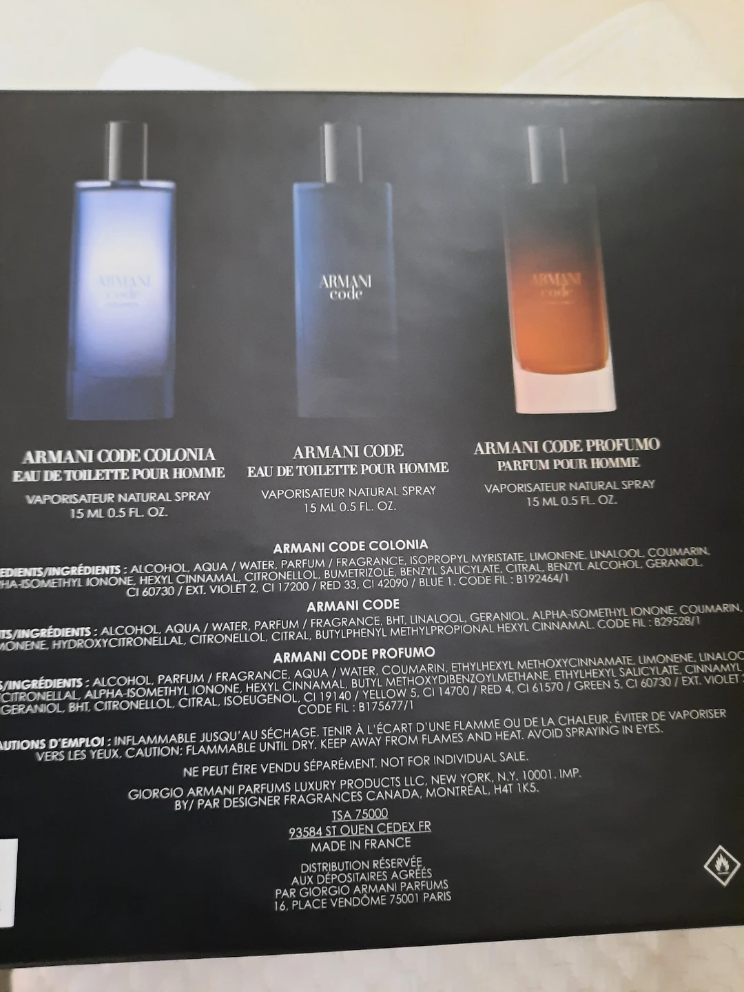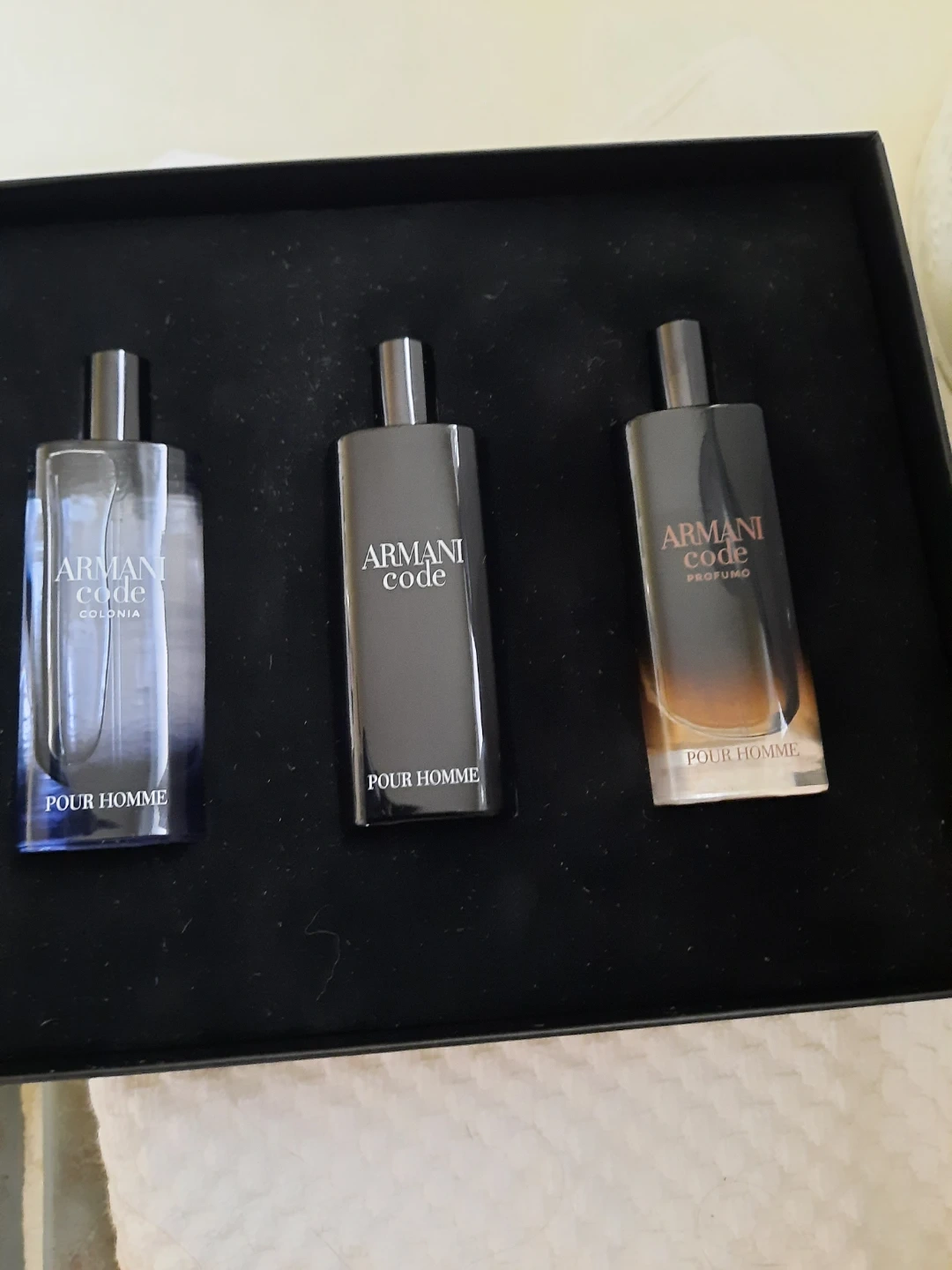 This Giorgio Armani gift set includes three 15ml bottles of Armani Code fragrances: Eau de Toilette Pour Homme, Eau de Toilette Pour Homme, and Parfum Pour Homme. Great for sampling the different scents!