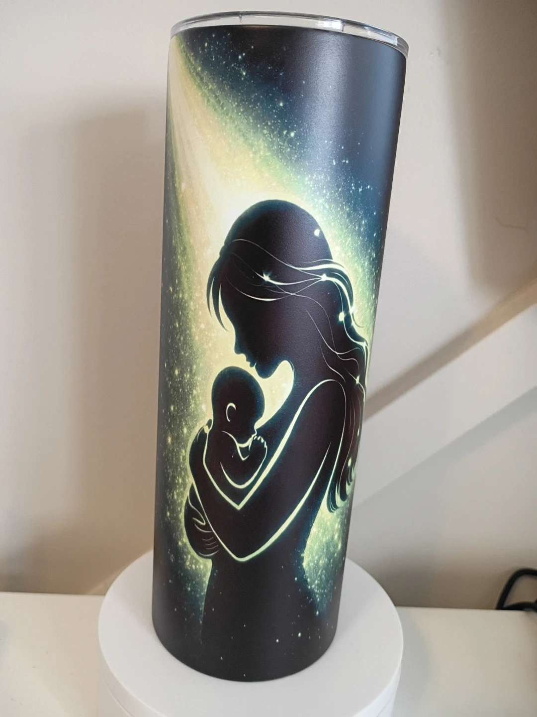 This tumbler features a beautiful silhouette design of a mother holding her baby, set against a starry, cosmic background. It's a 20oz insulated tumbler, perfect for keeping your drinks hot or cold. This would make a thoughtful gift for any new mom or mother figure!