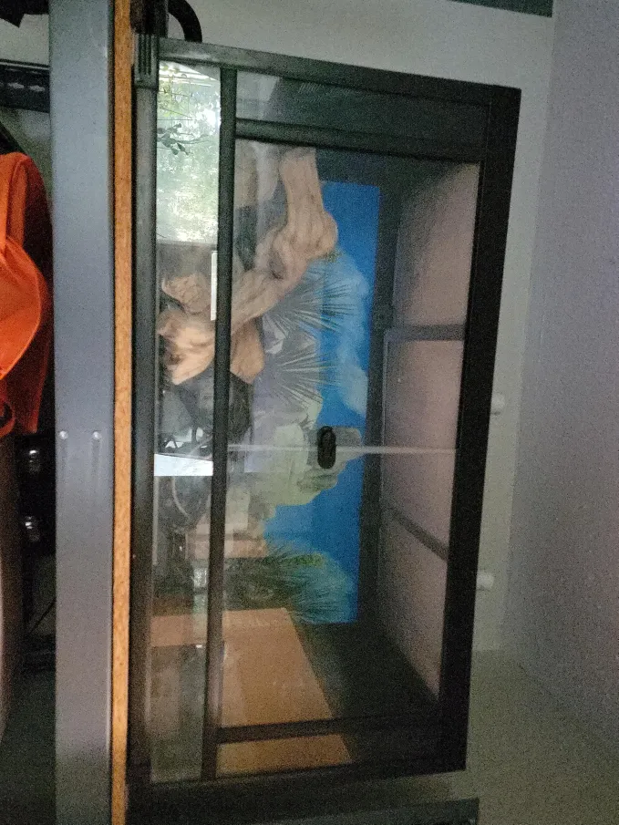 This is a glass terrarium enclosure, suitable for reptiles or small animals. It features sliding glass doors for easy access. Includes a decorative background and some driftwood.