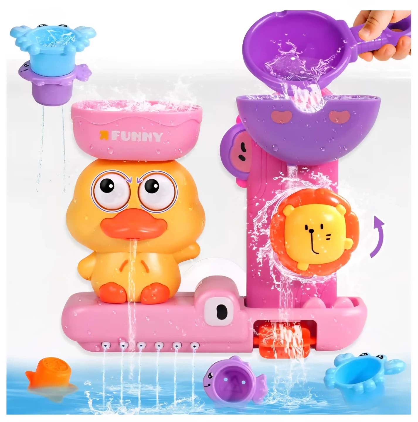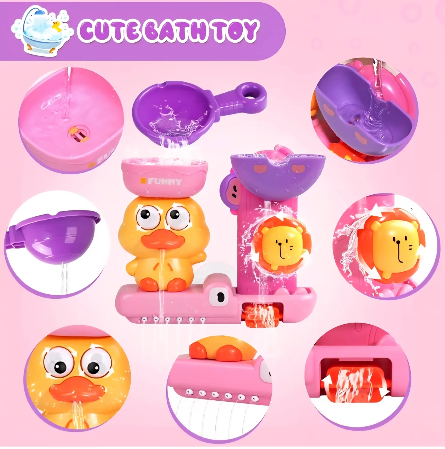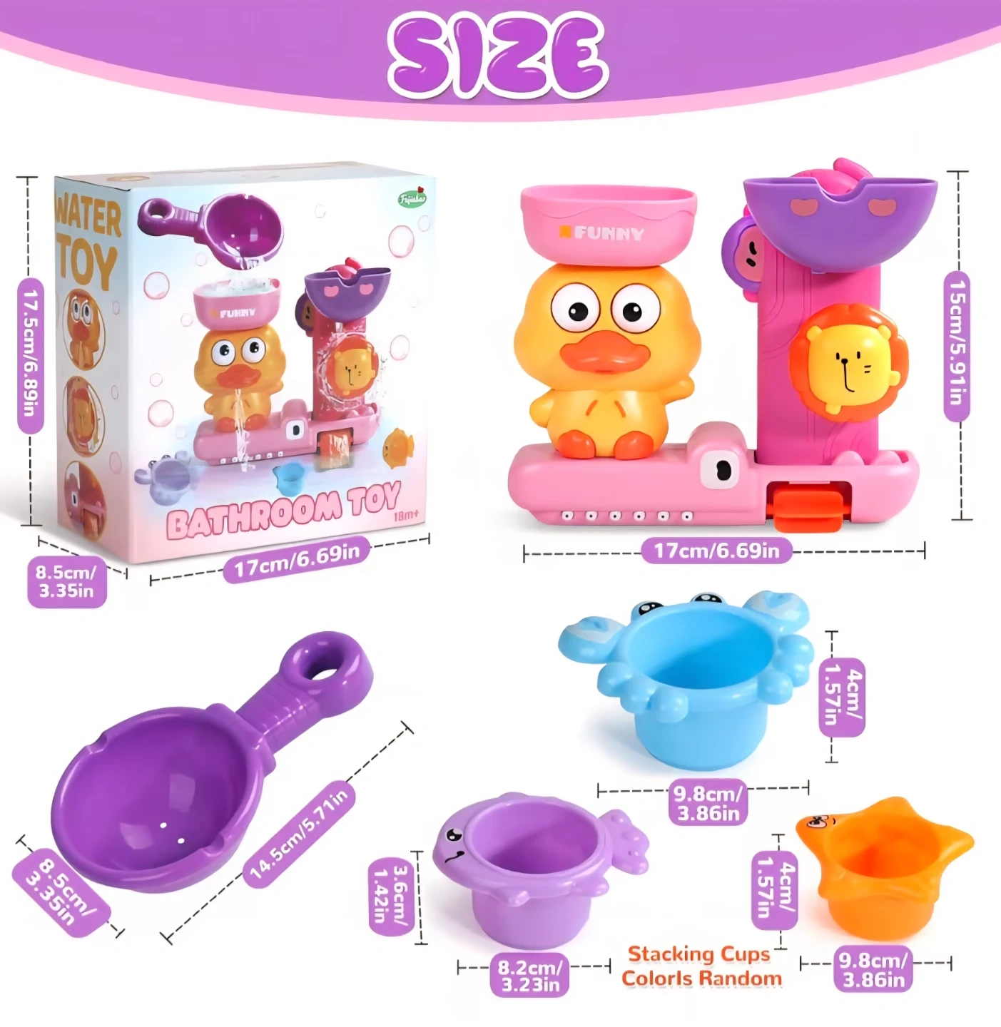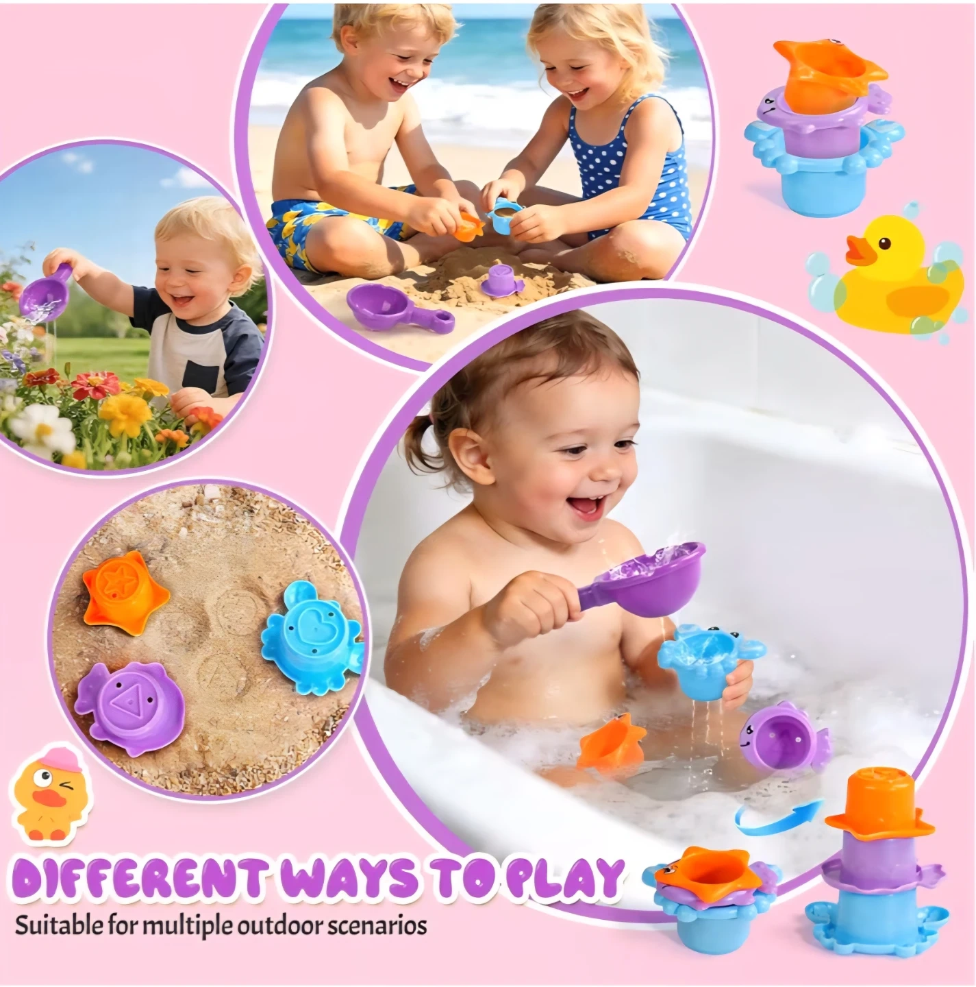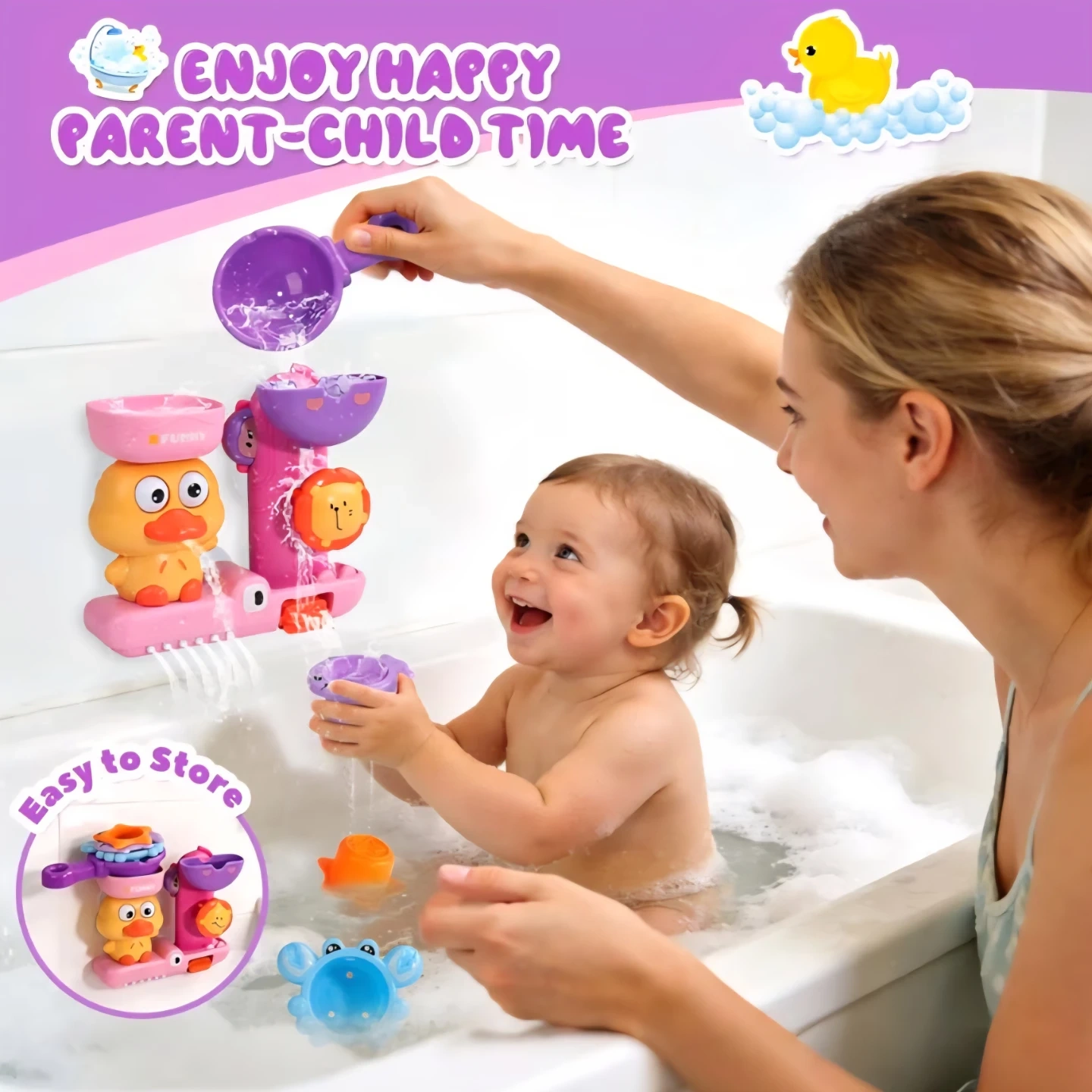 Bath Toys for Toddler 1-3 Year Old, Interactive Duck Learning Set with 3 Stacking Cups & Water Spoon,Fast-Drying Bathtub Gifts for Kids (Pink)