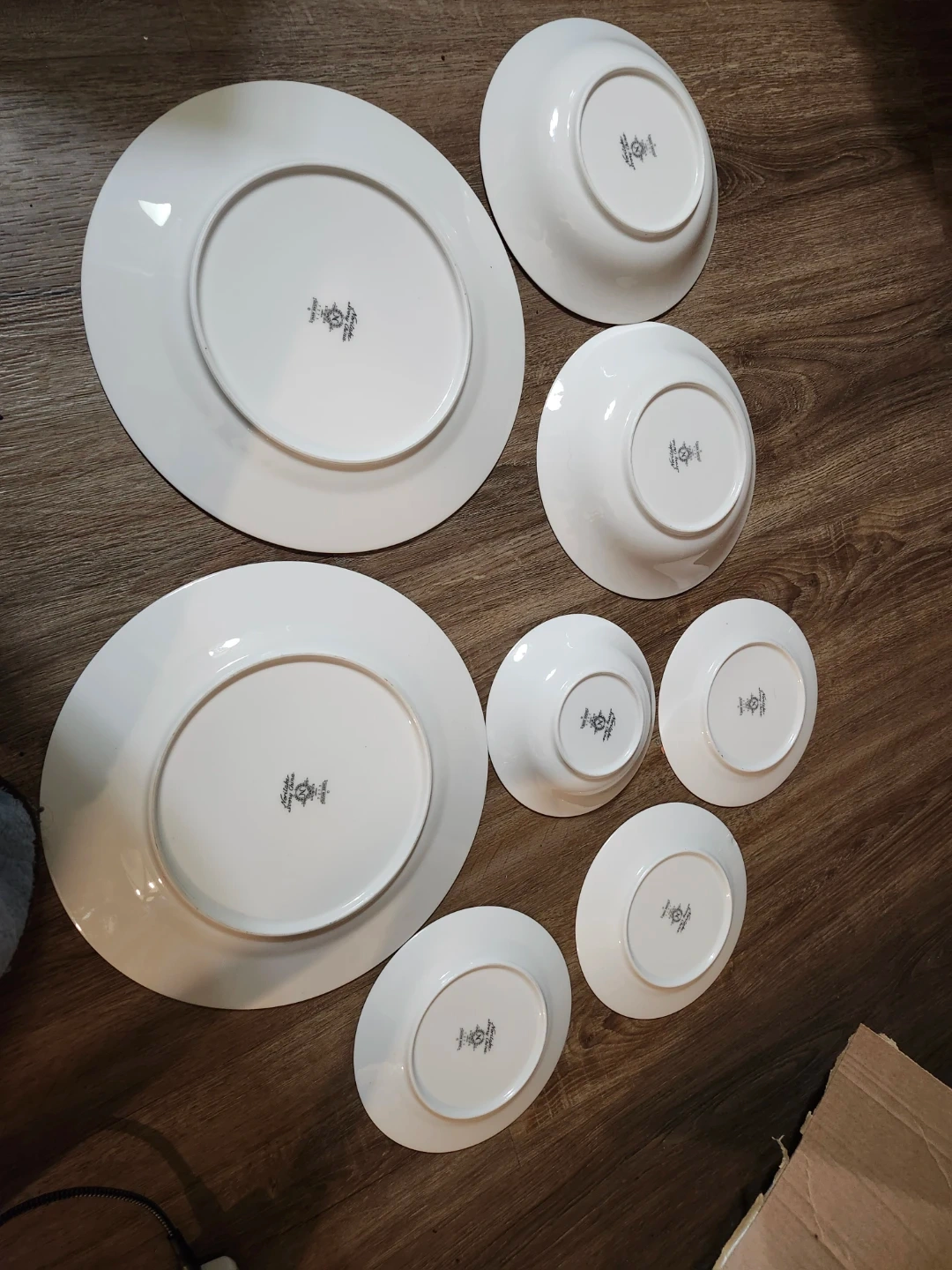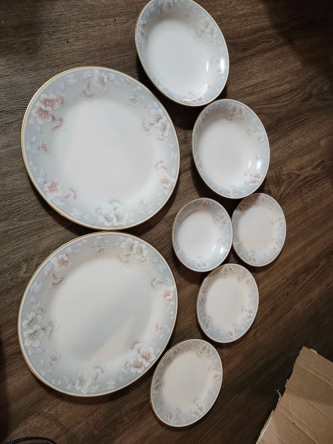 A lovely china dinnerware set with a delicate floral design and gold trim. Includes serving platters and bowls. Dishwasher safe. Perfect for special occasions or everyday elegance!