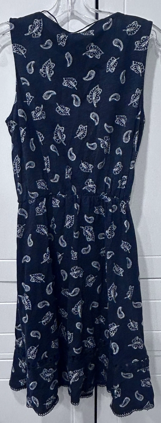 Blue sleeveless dress with white floral pattern.