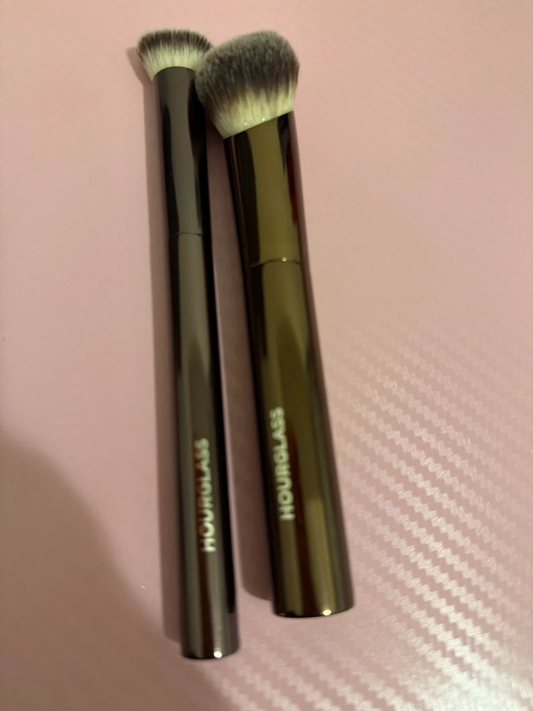 This listing is for two Hourglass makeup brushes. One brush has a dense, angled head and the other is a smaller, domed brush. They're made with synthetic bristles and have sleek, metallic handles.