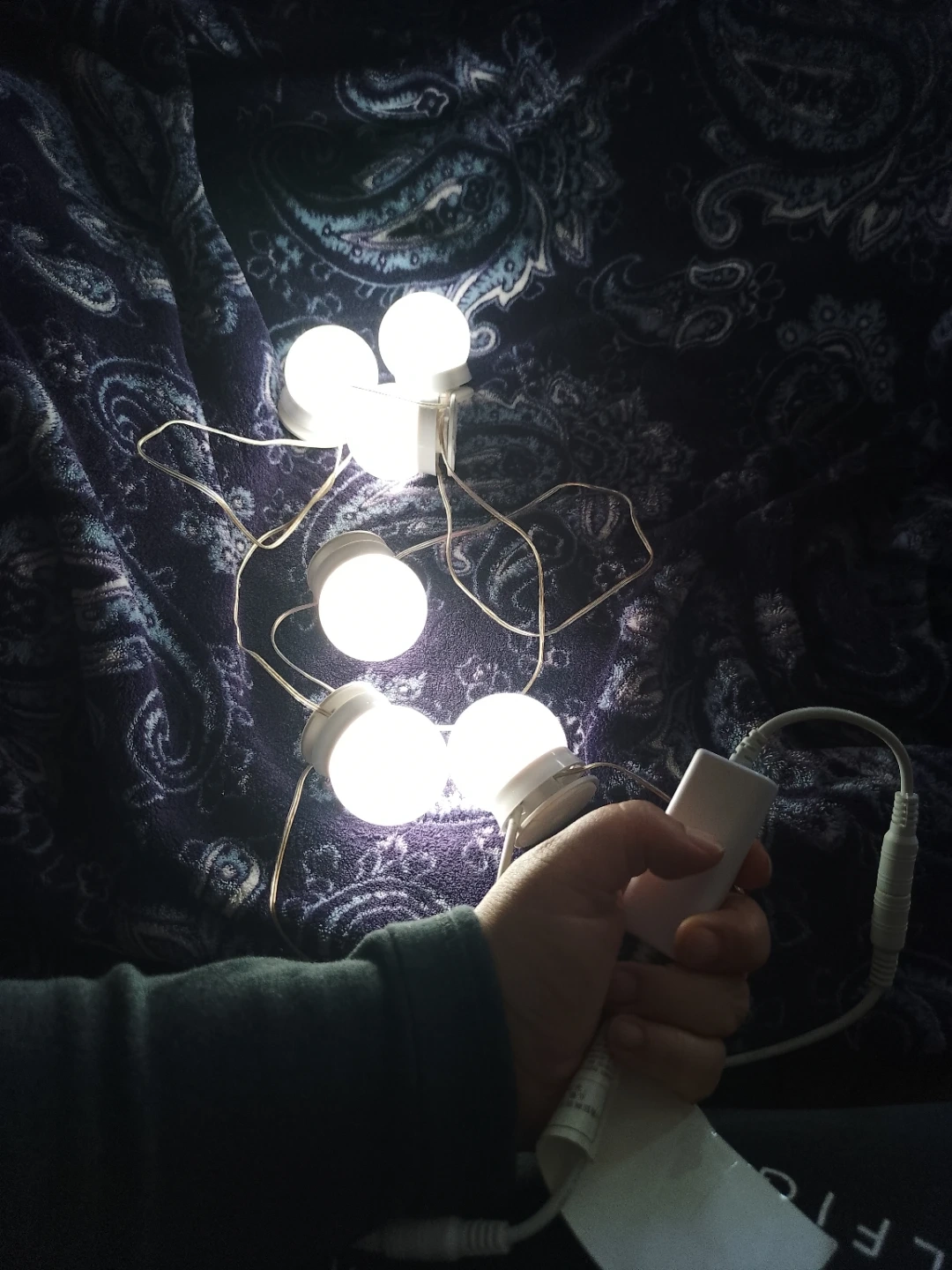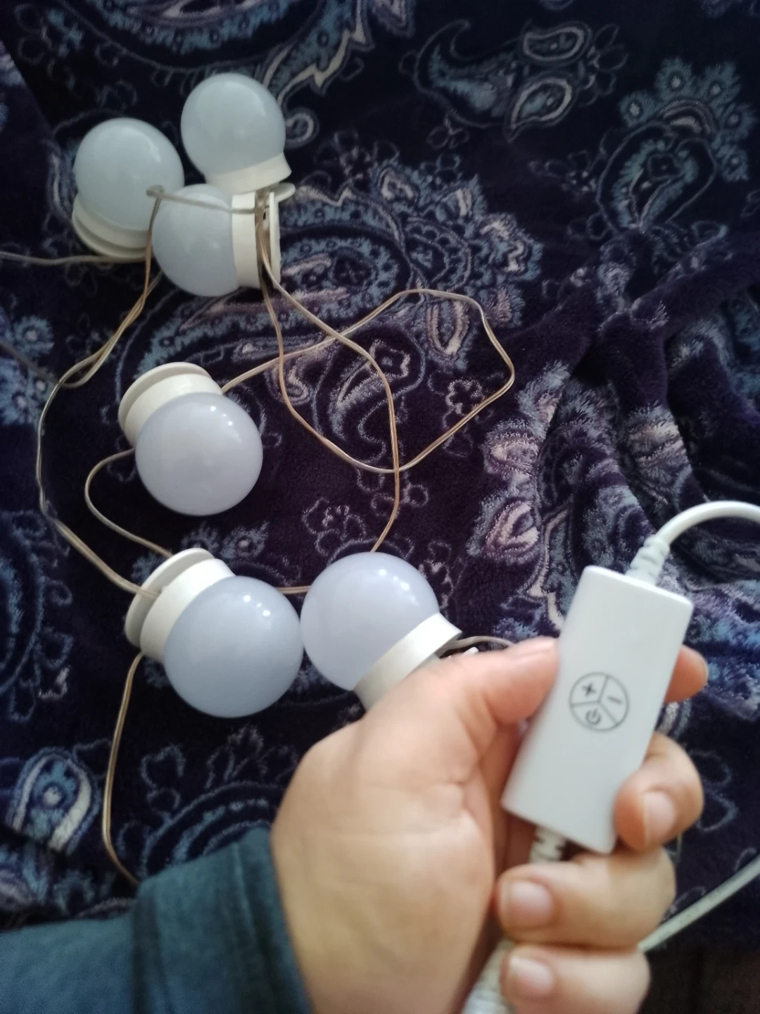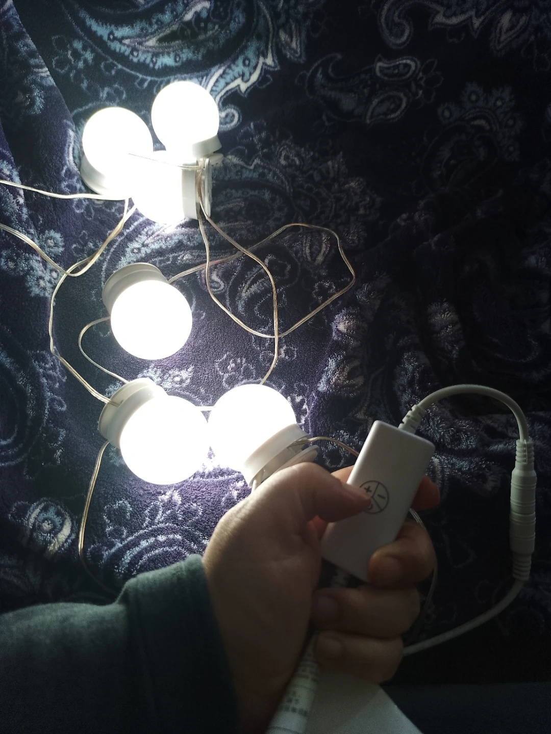 This is a set of 6 LED vanity mirror lights with adjustable brightness and colour temperature. They come with a control box and power adapter. These lights are great for adding illumination to your makeup area or dressing table!