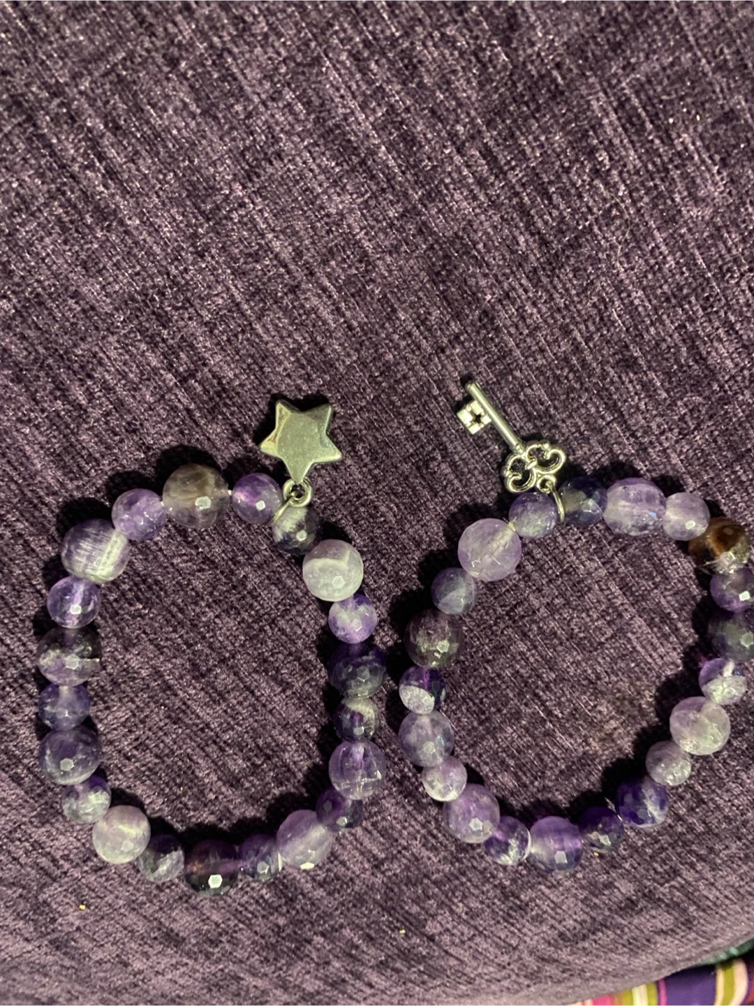 Two stretchy beaded bracelets made with purple amethyst beads. One bracelet has a silver-tone star charm, and the other has a silver-tone key charm. Beads appear to be genuine amethyst.