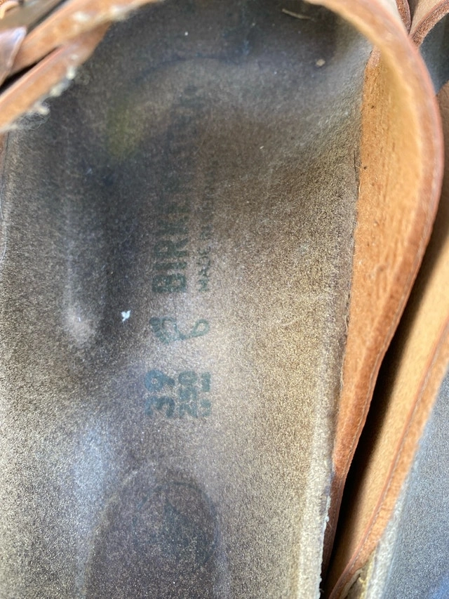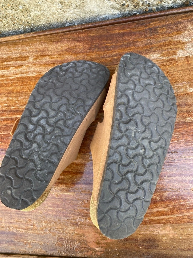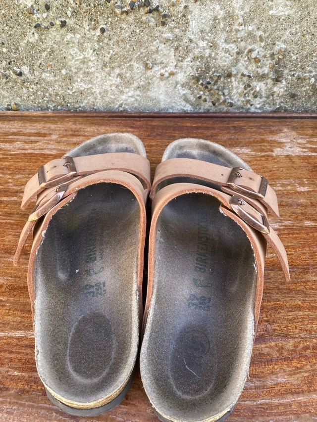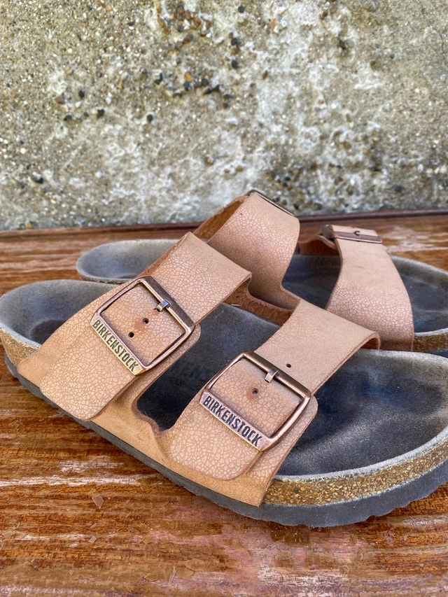 These are a pair of used women's Birkenstock Arizona sandals, size 39 (Women's 8-8.5), perfect for casual wear. They have a comfortable, adjustable footbed and straps for a snug fit. These have been worn and show signs of wear, but are still in good condition for continued use. I would rate them as fair condition, as seen in the photos. If you're looking for a reliable and comfortable pair of sandals, these are a great option!